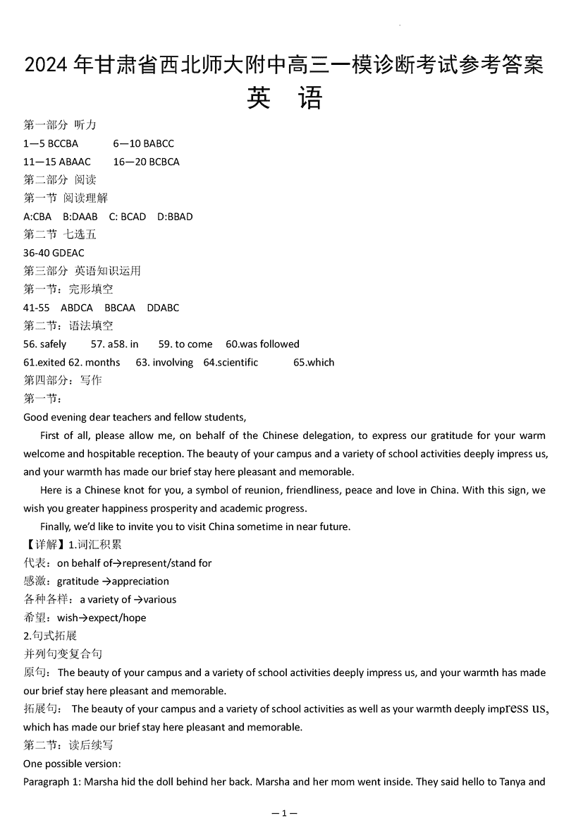 甘肃西北师大附中2025届高三上学期一模英语考试已于近日开考,为方便考生考后及时查看考试情况,查漏补缺、弥补不足,本文整理了试题答案解析相关信息!