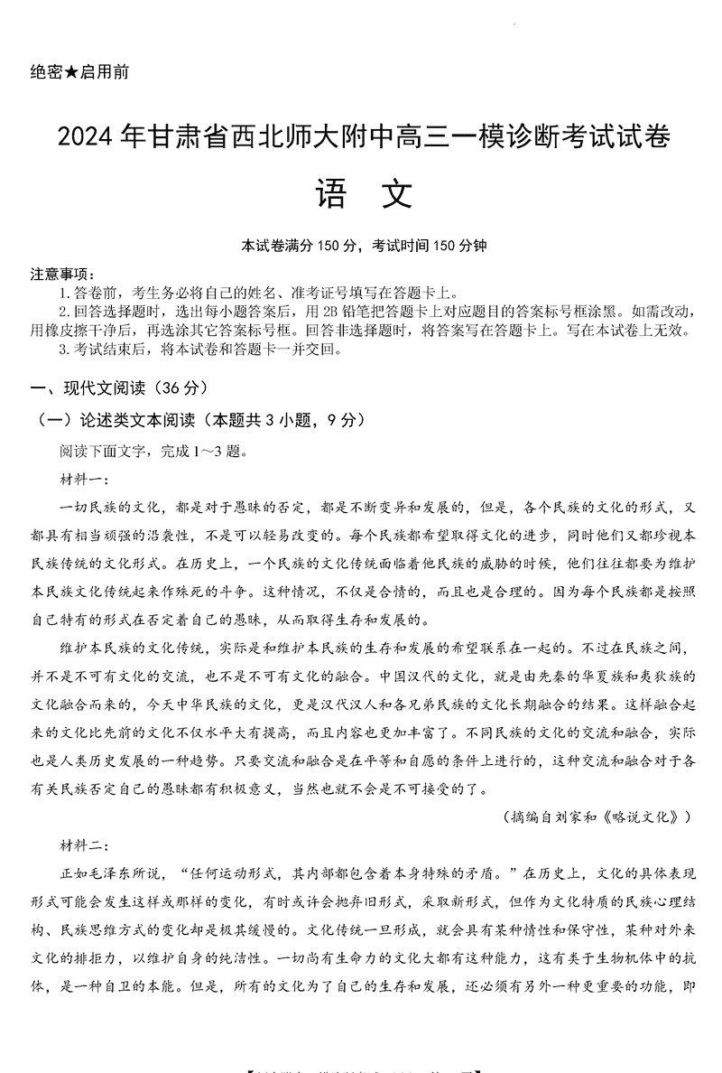 甘肃西北师大附中2025届高三上学期一模语文试题及答案