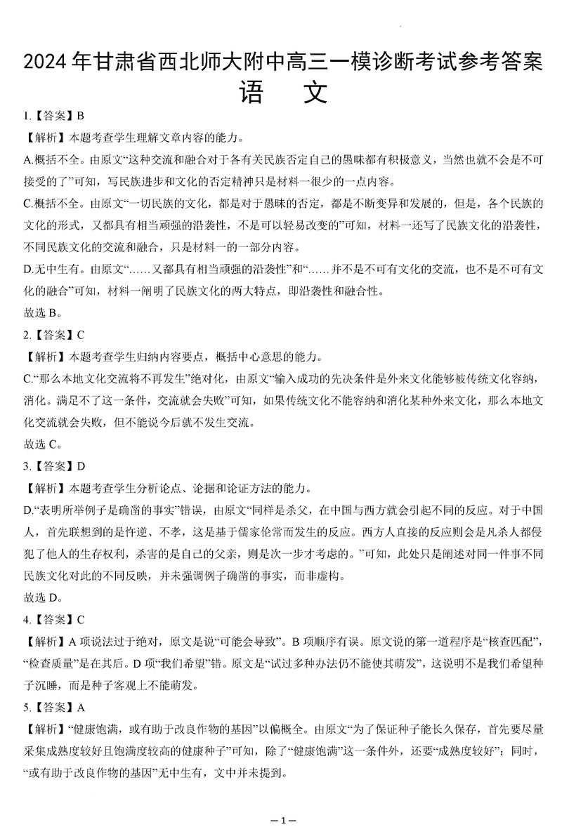 甘肃西北师大附中2025届高三上学期一模语文考试已于近日开考,为方便考生考后及时查看考试情况,查漏补缺、弥补不足,本文整理了试题答案解析相关信息!