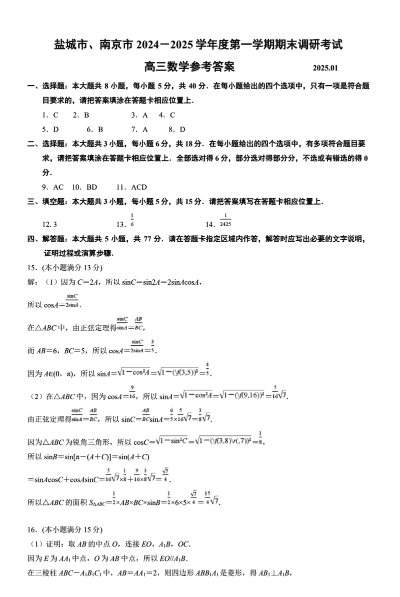 南京市、盐城市2025届高三上学期期末一模数学考试已于近日开考,为方便考生考后及时查看考试情况,查漏补缺、弥补不足,本文整理了试题答案解析相关信息!