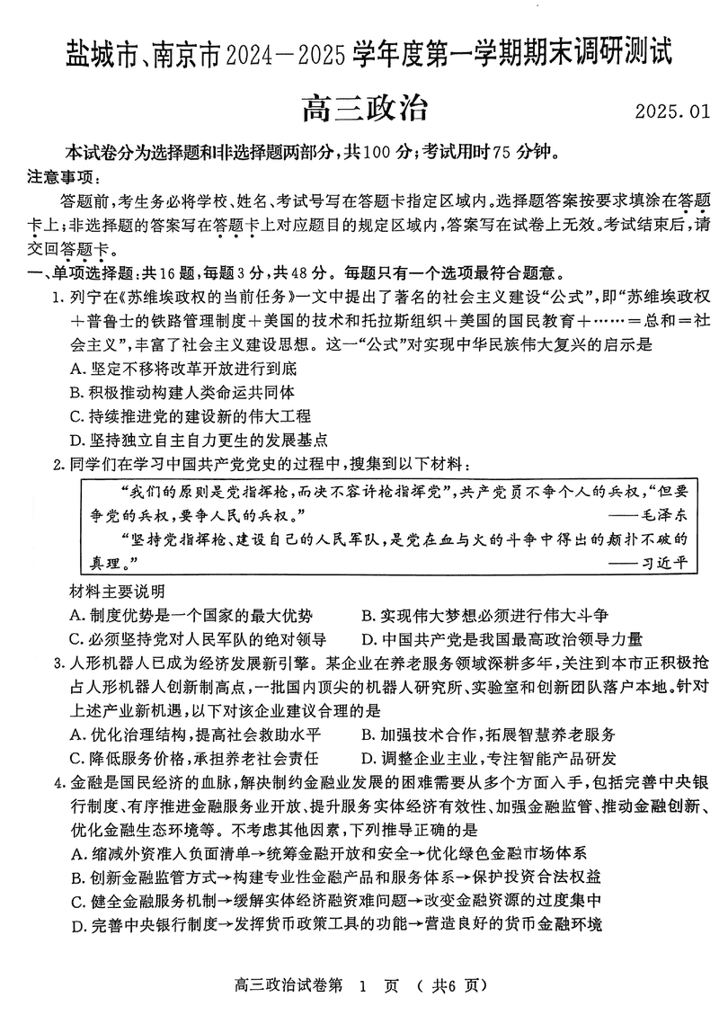 南京市、盐城市2025届高三上学期期末一模政治试题及答案