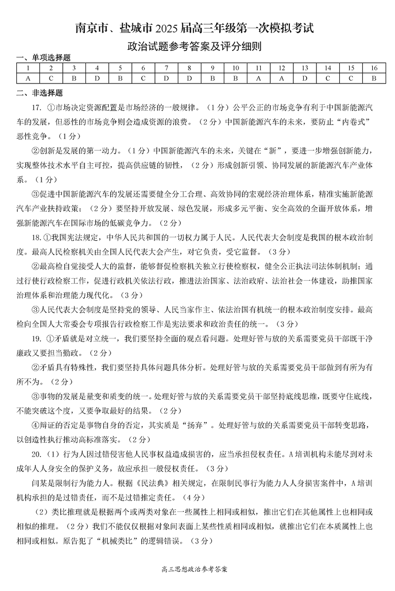 南京市、盐城市2025届高三上学期期末一模政治考试已于近日开考,为方便考生考后及时查看考试情况,查漏补缺、弥补不足,本文整理了试题答案解析相关信息!