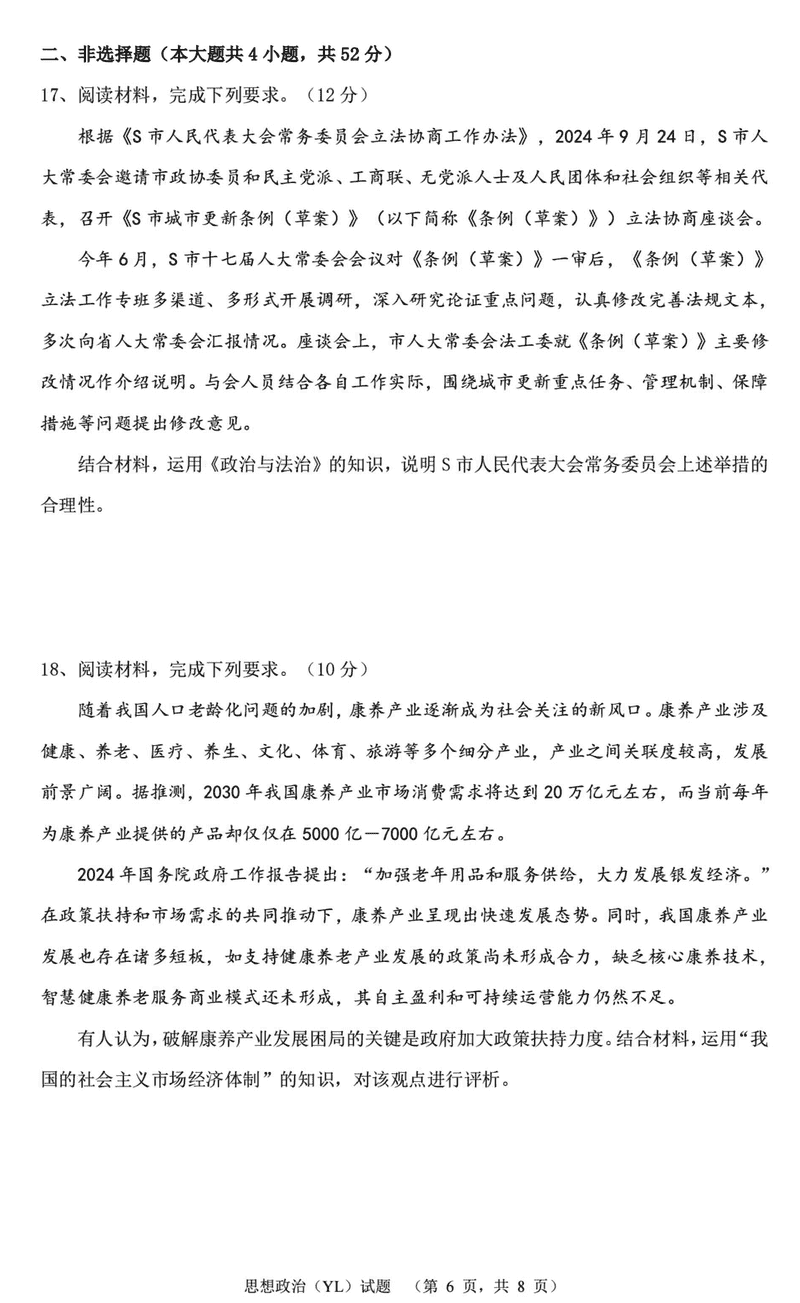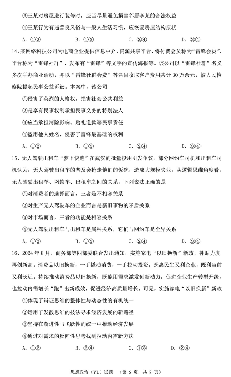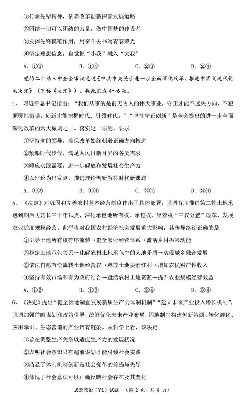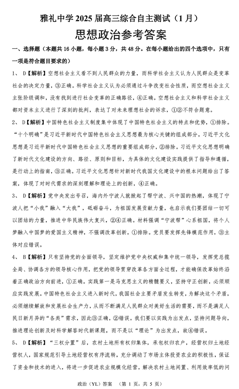 湖南雅礼中学2025届高三上学期1月期末综合自主测试政治试题及答案