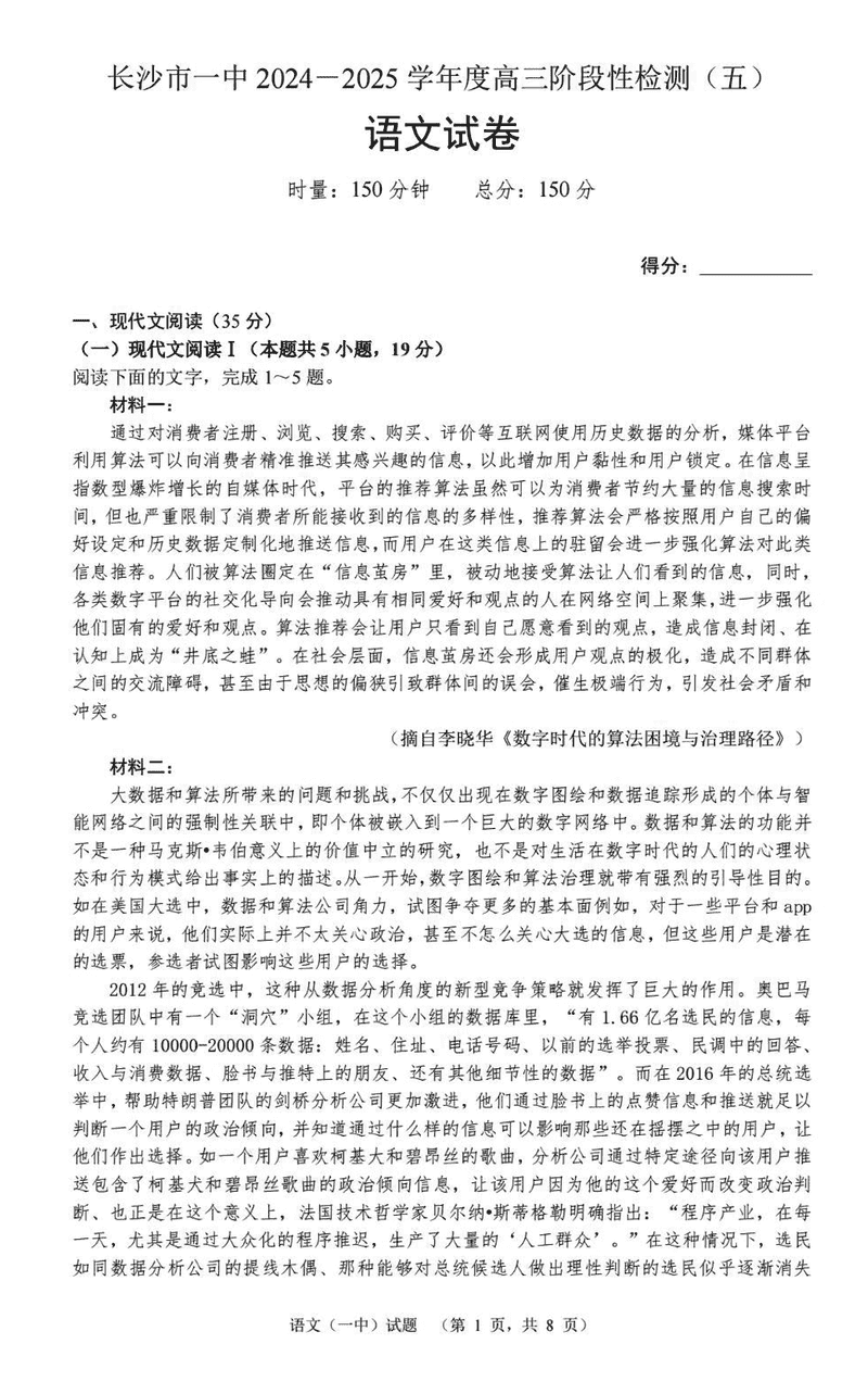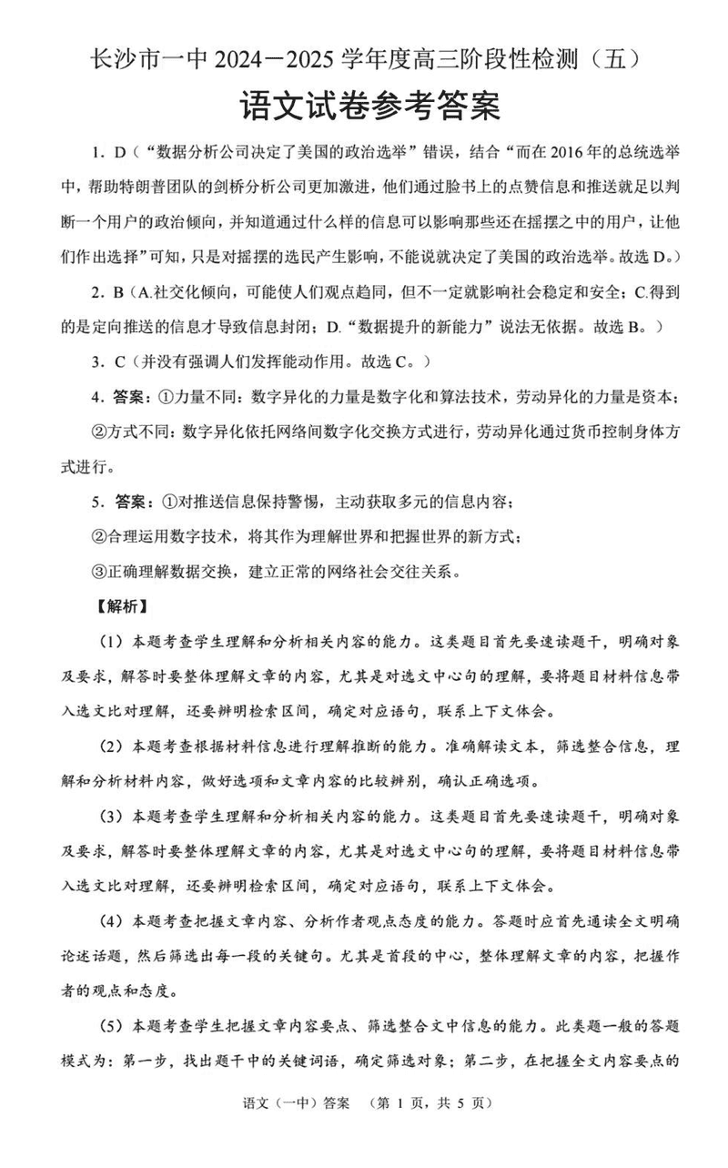 湖南长沙一中2025届高三上学期阶段性检测(五)语文考试已于近日开考,为方便考生考后及时查看考试情况,查漏补缺、弥补不足,本文整理了试题答案解析相关信息!