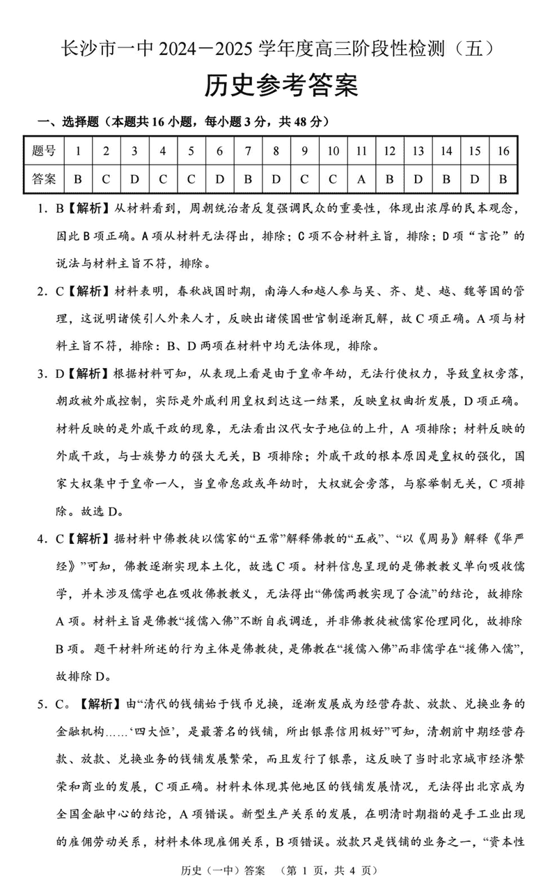 湖南长沙一中2025届高三上学期阶段性检测(五)历史考试已于近日开考,为方便考生考后及时查看考试情况,查漏补缺、弥补不足,本文整理了试题答案解析相关信息!