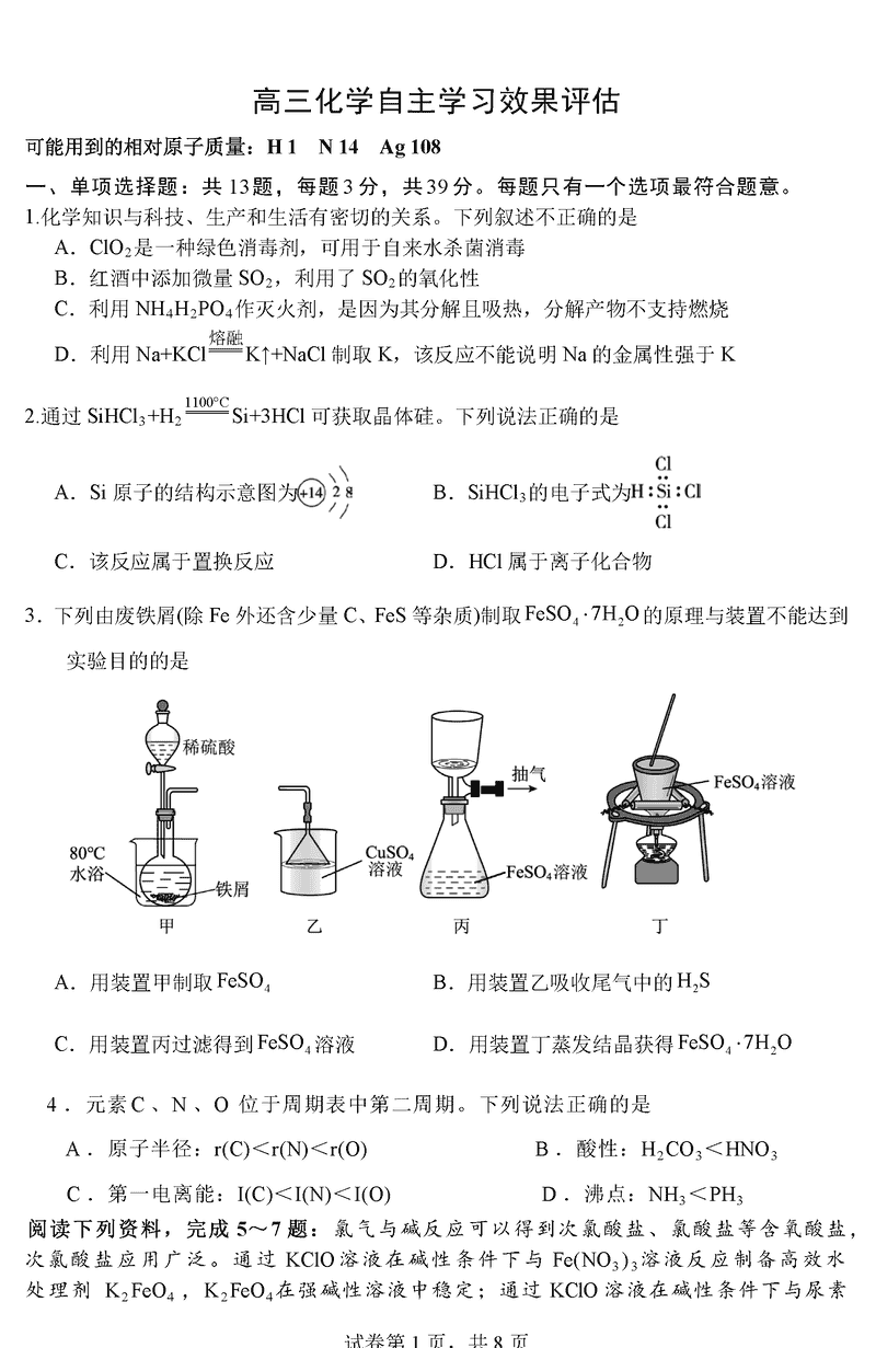 江苏扬州中学2025届高三上学期1月自主评估化学考试已于近日开考,为方便考生考后及时查看考试情况,查漏补缺、弥补不足,本文整理了试题答案解析相关信息!