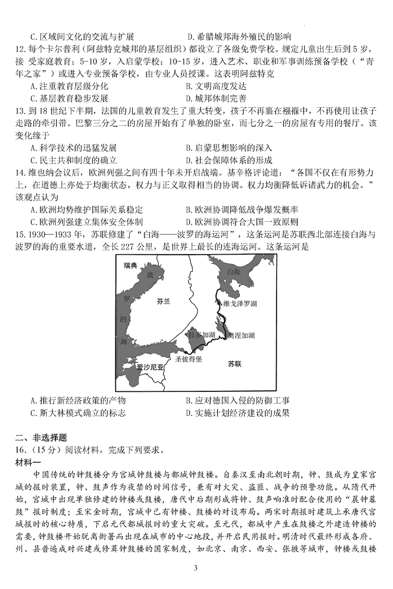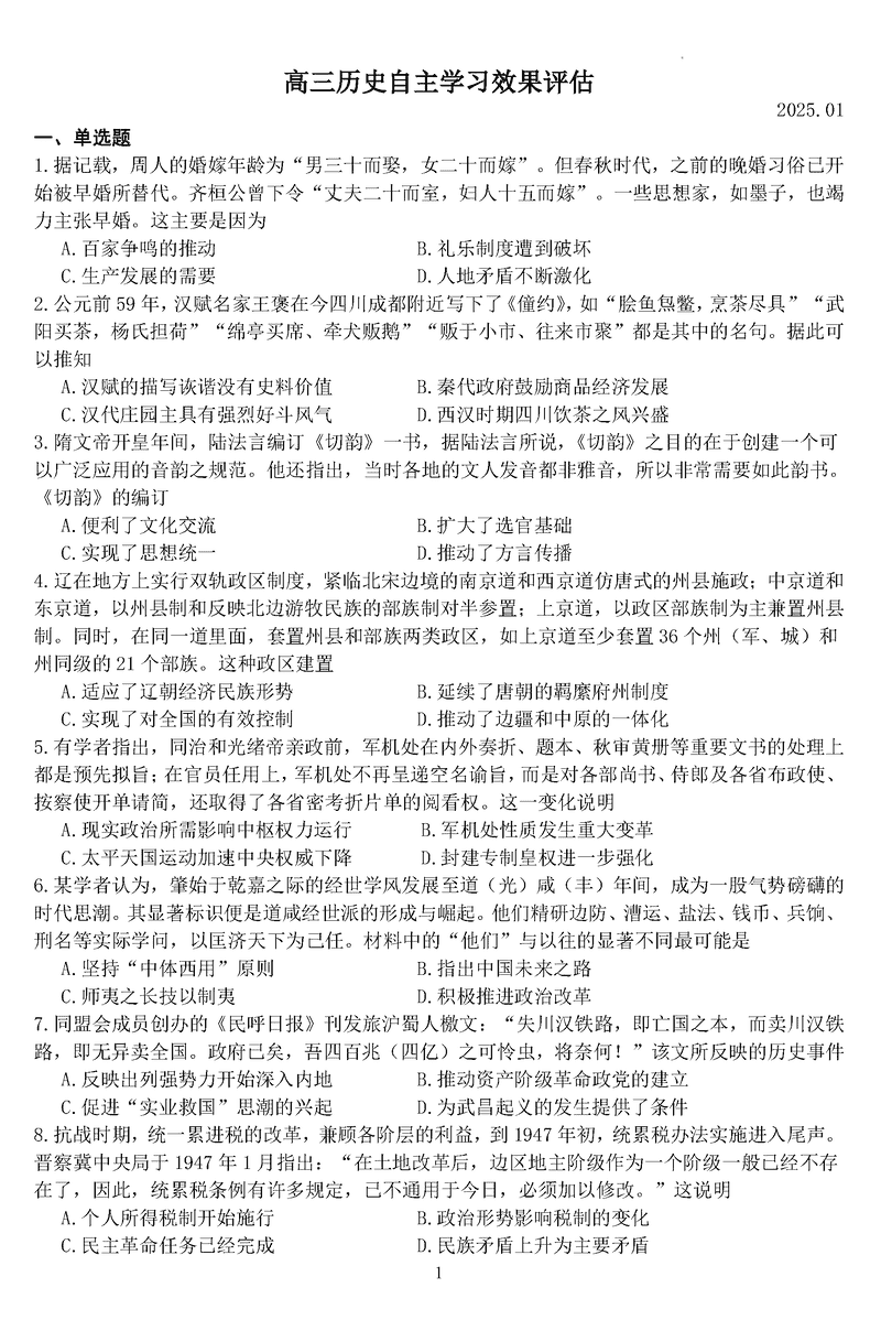 江苏扬州中学2025届高三上学期1月自主评估历史试题及答案
