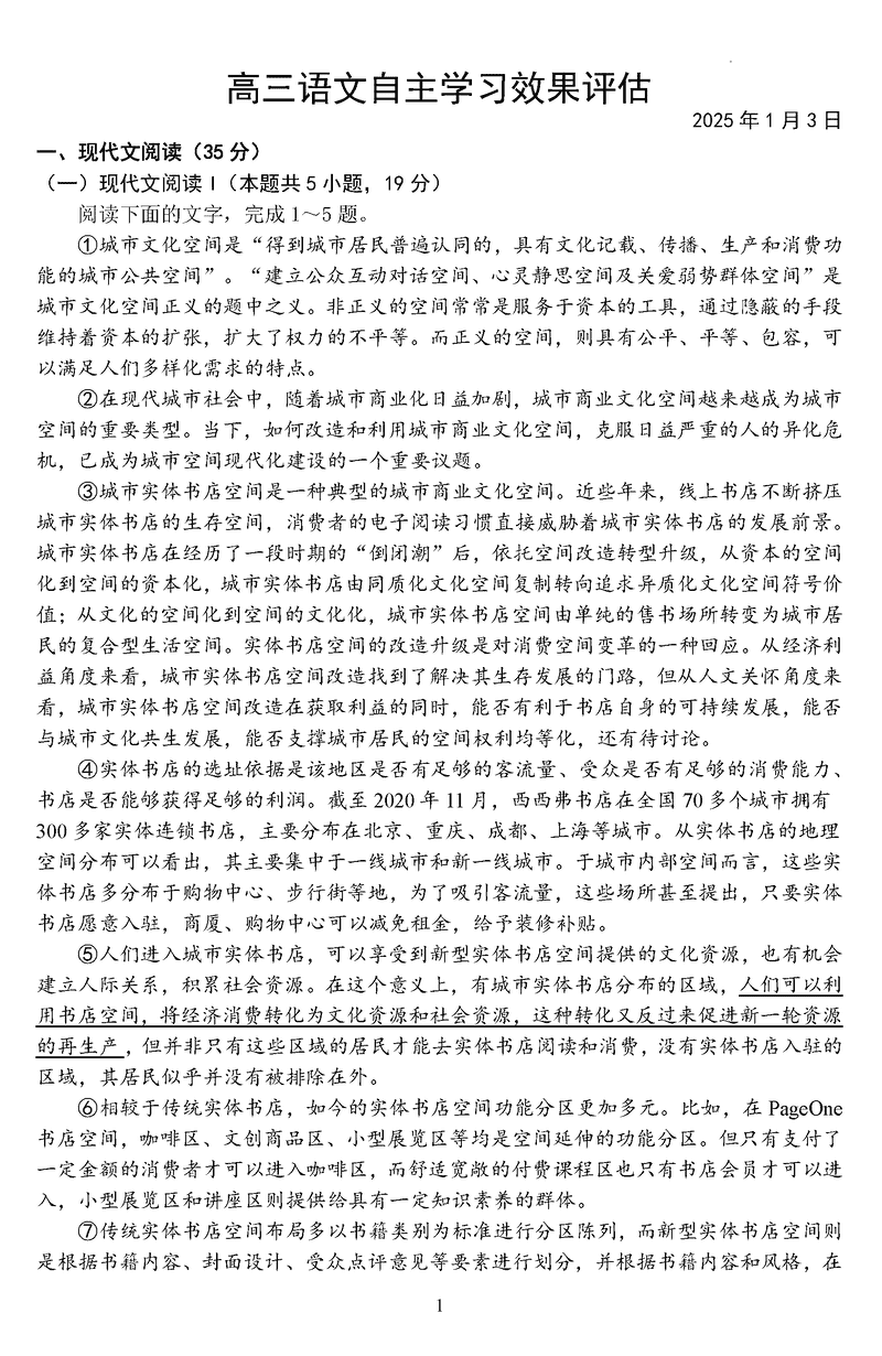 江苏扬州中学2025届高三上学期1月自主评估语文试题及答案