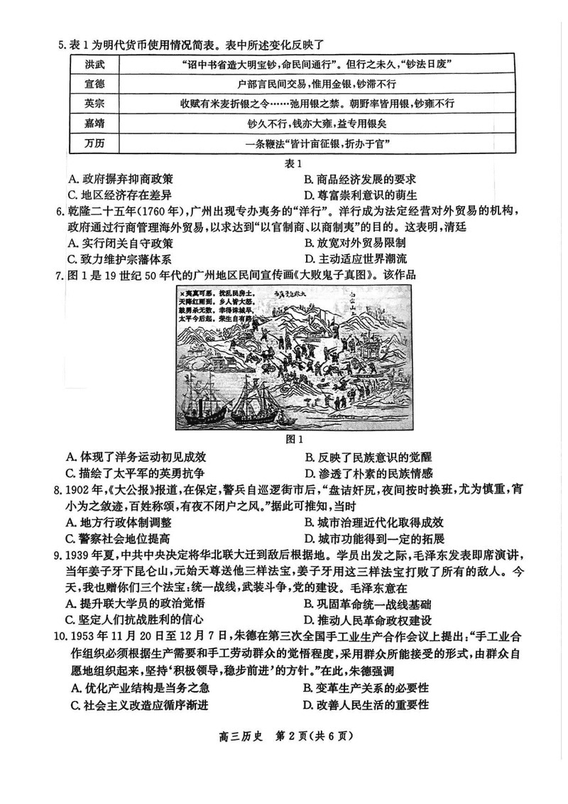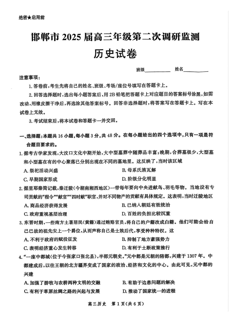 河北邯郸2025届高三上学期第二次调研监测历史试题及答案