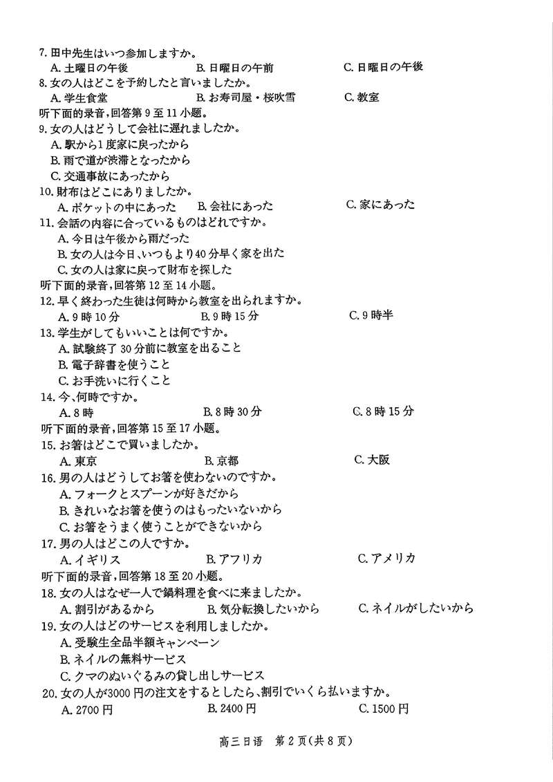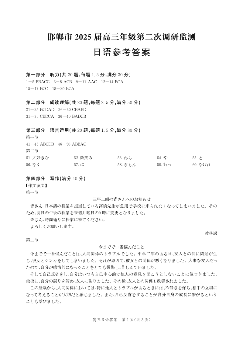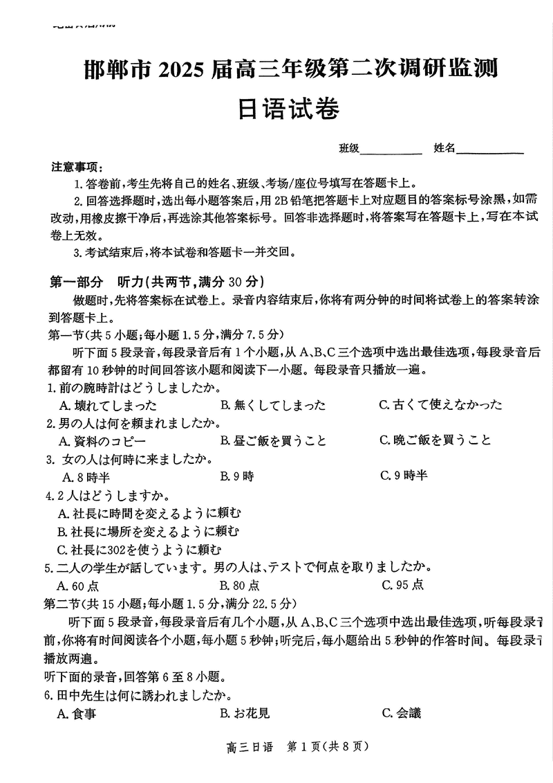 河北邯郸2025届高三上学期第二次调研监测日语考试已于近日开考,为方便考生考后及时查看考试情况,查漏补缺、弥补不足,本文整理了试题答案解析相关信息!