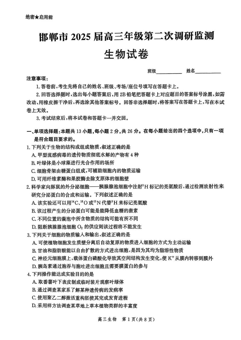 河北邯郸2025届高三上学期第二次调研监测生物考试已于近日开考,为方便考生考后及时查看考试情况,查漏补缺、弥补不足,本文整理了试题答案解析相关信息!