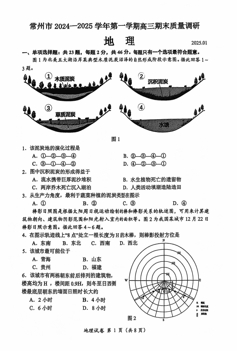 常州市2024-2025学年高三上学期期末地理试题及答案