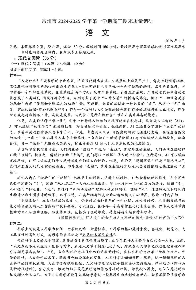 常州市2024-2025学年高三上学期期末语文试题及答案