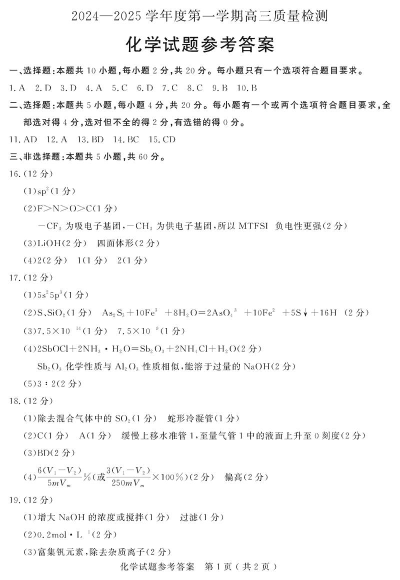 济宁2024-2025学年高三上学期1月期末化学试题及答案
