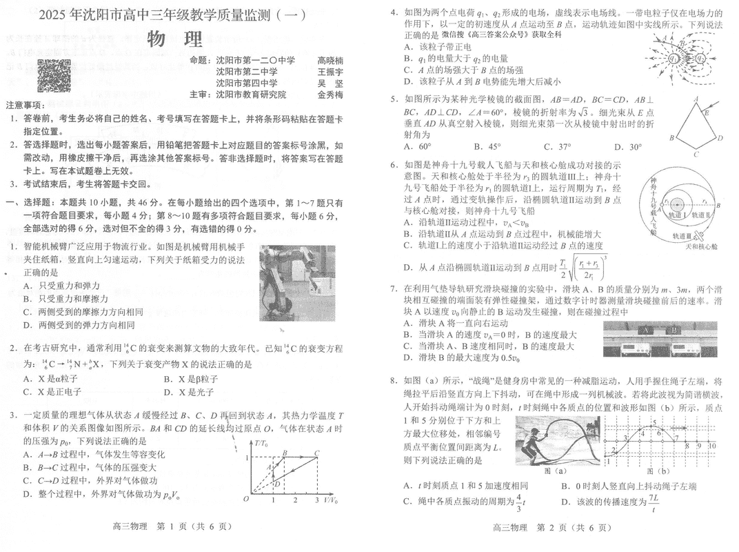 沈阳2025届高三上学期教学质量监测(一)物理考试已于近日开考,为方便考生考后及时查看考试情况,查漏补缺、弥补不足,本文整理了试题答案解析相关信息!