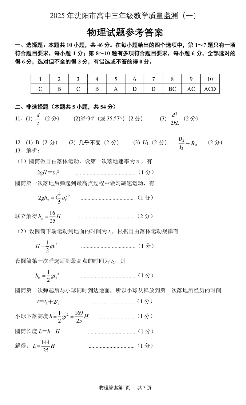 沈阳2025届高三上学期教学质量监测(一)物理试题及答案