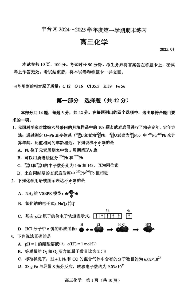 北京市丰台区2024-2025学年高三上学期期末化学试题及答案