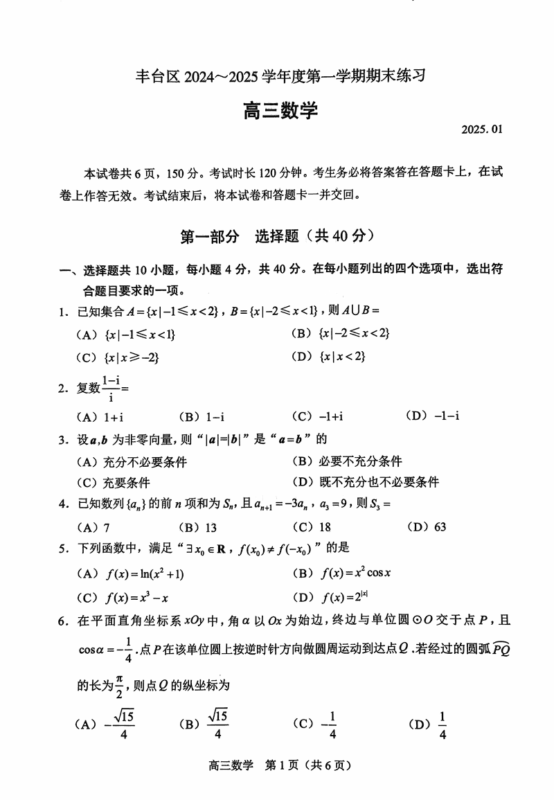 北京市丰台区2024-2025学年高三上学期期末数学试题及答案