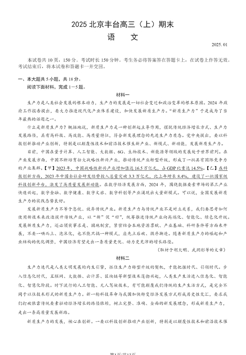 北京市丰台区2024-2025学年高三上学期期末语文试题及答案