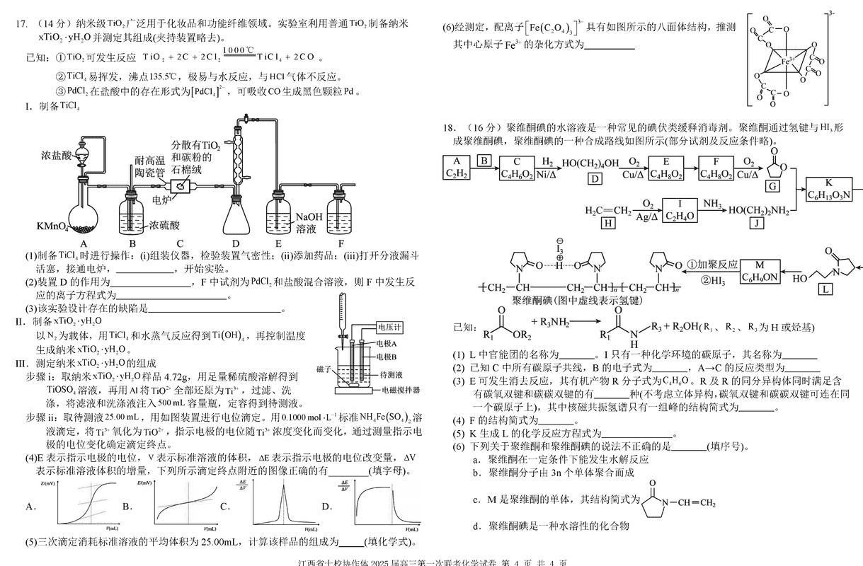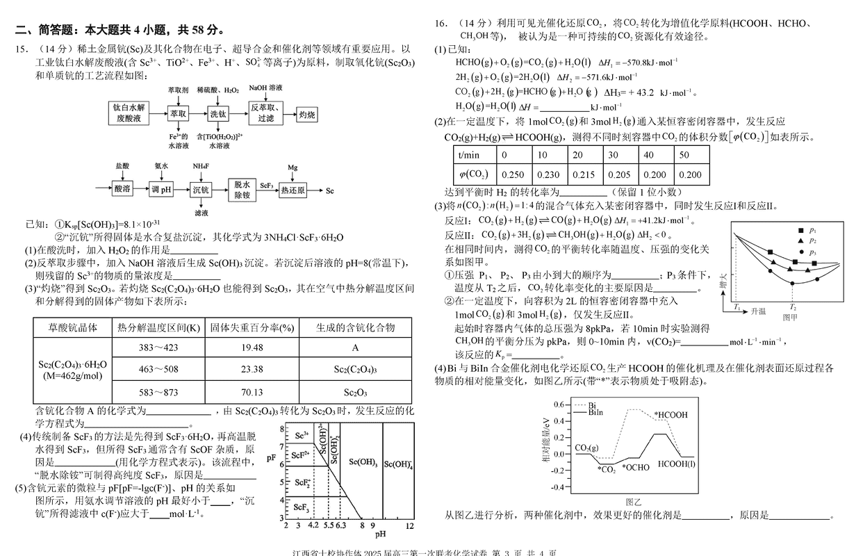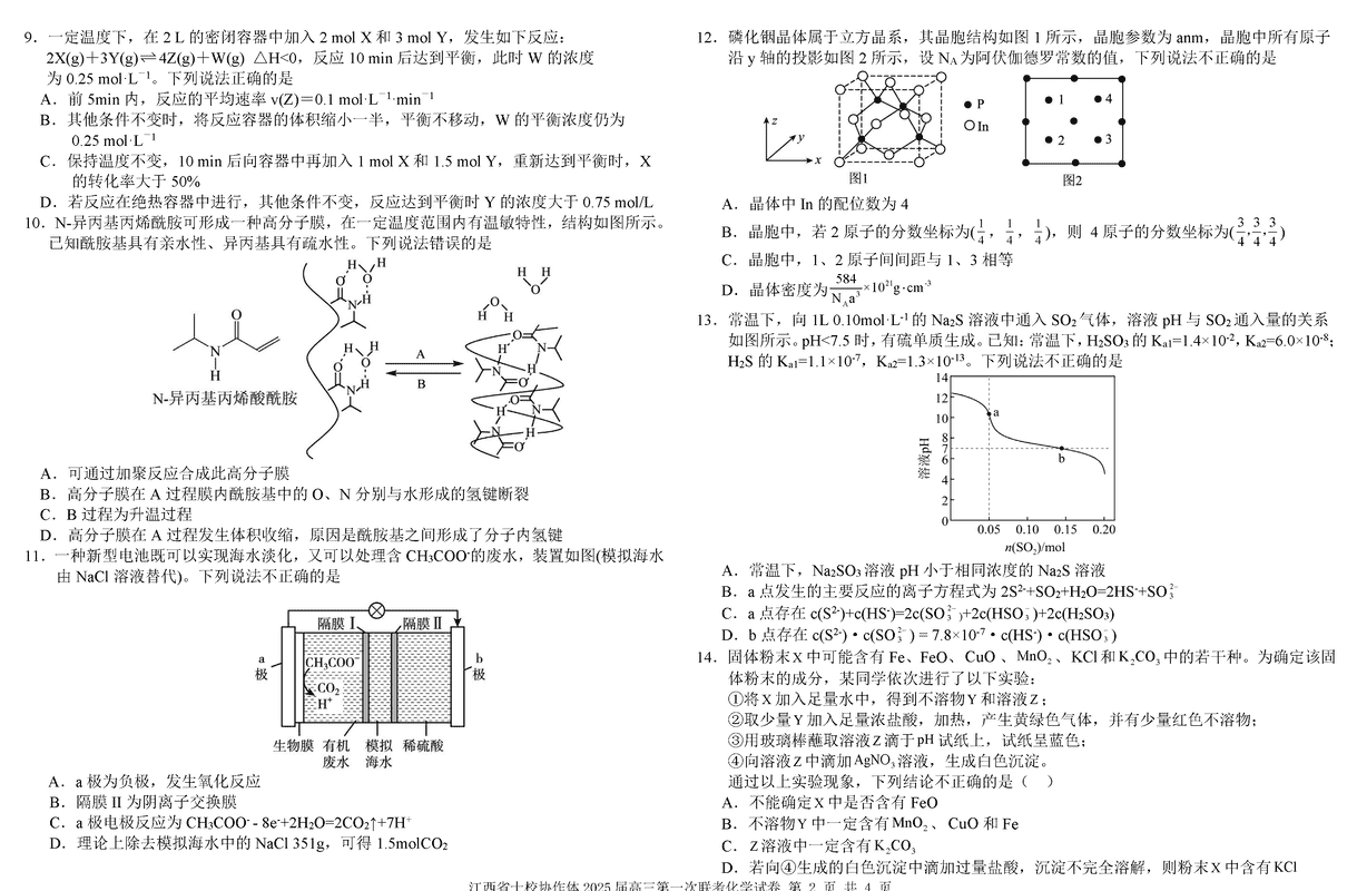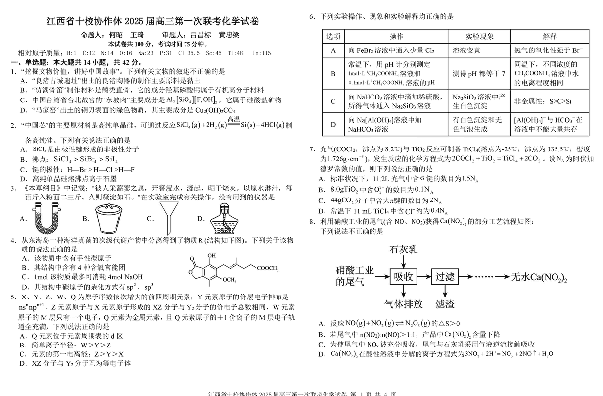 江西省十校协作体2025届高三第一次联考化学试题及答案