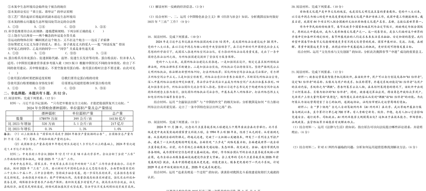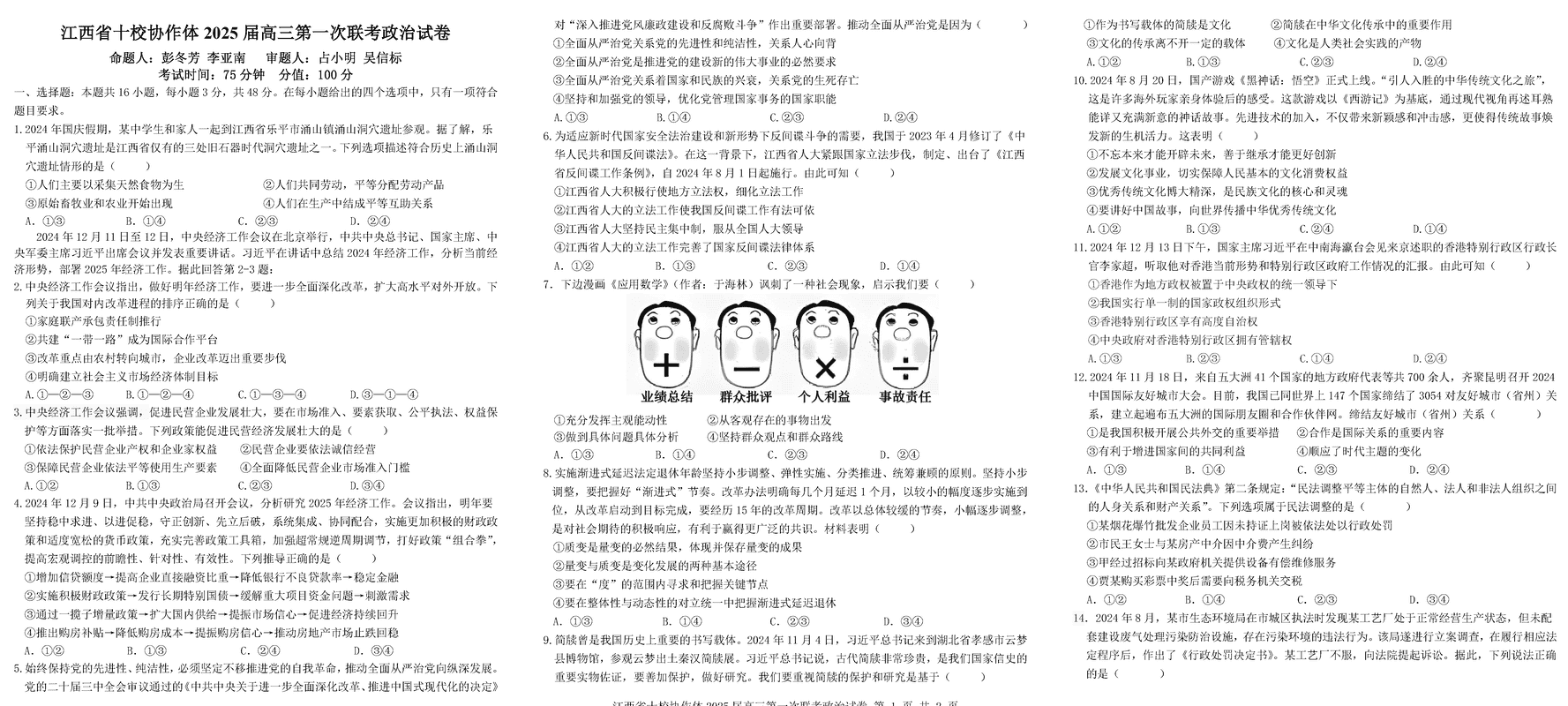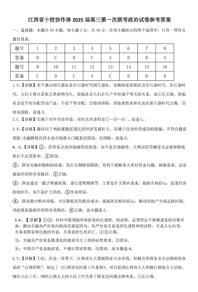 江西省十校协作体2025届高三第一次联考政治试题及答案