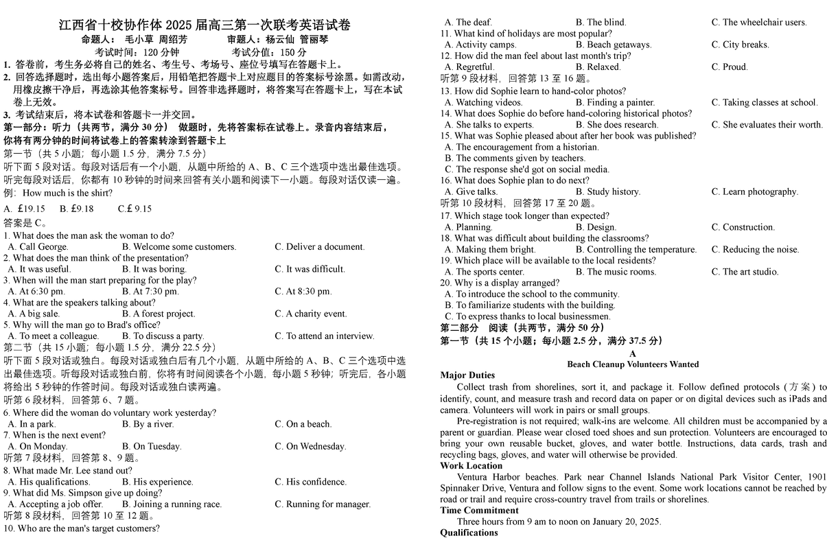 江西省十校协作体2025届高三第一次联考英语考试已于近日开考,为方便考生考后及时查看考试情况,查漏补缺、弥补不足,本文整理了试题答案解析相关信息!