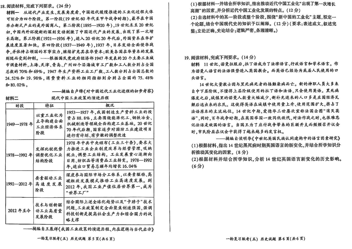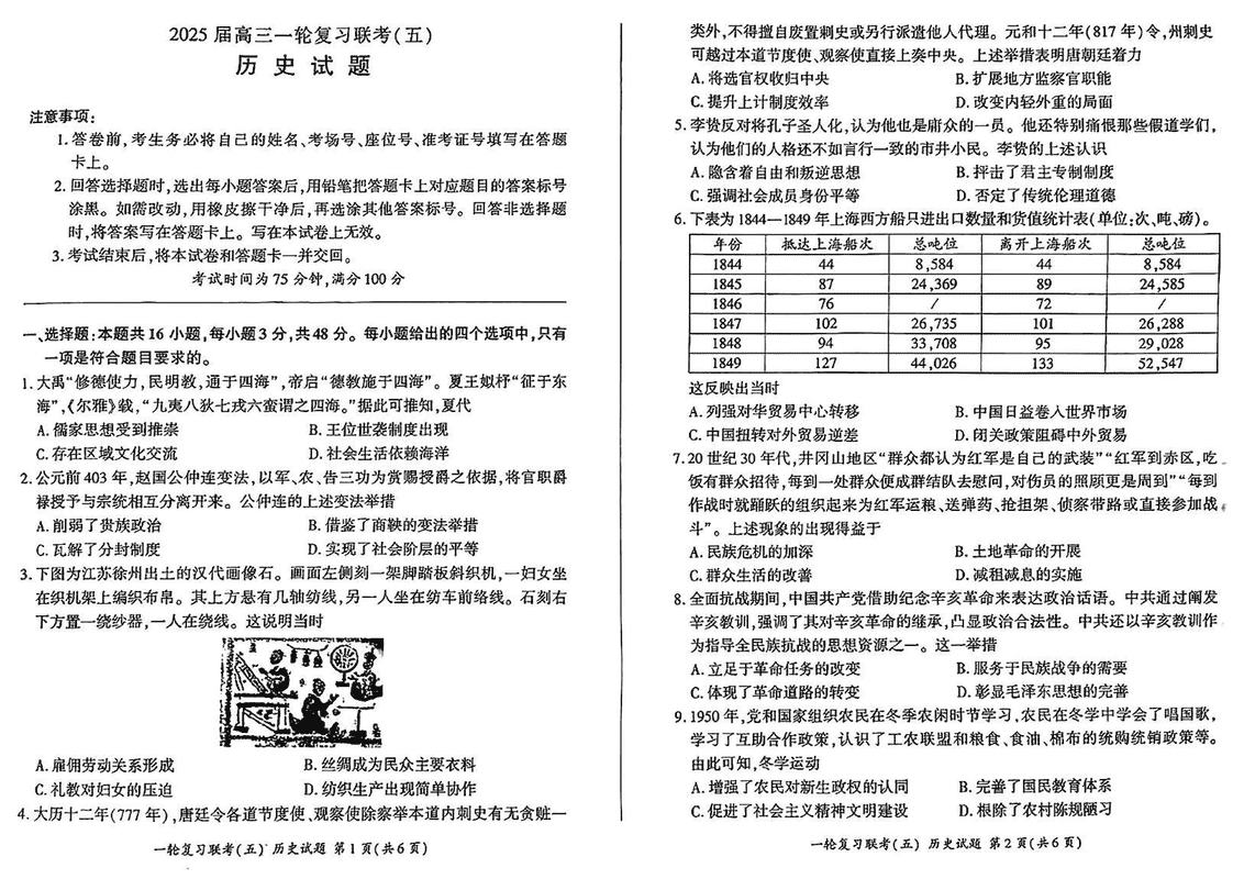 百师联盟2025届高三一轮复习联考(五)历史试题及答案