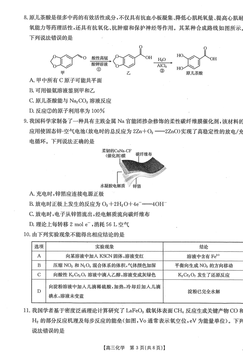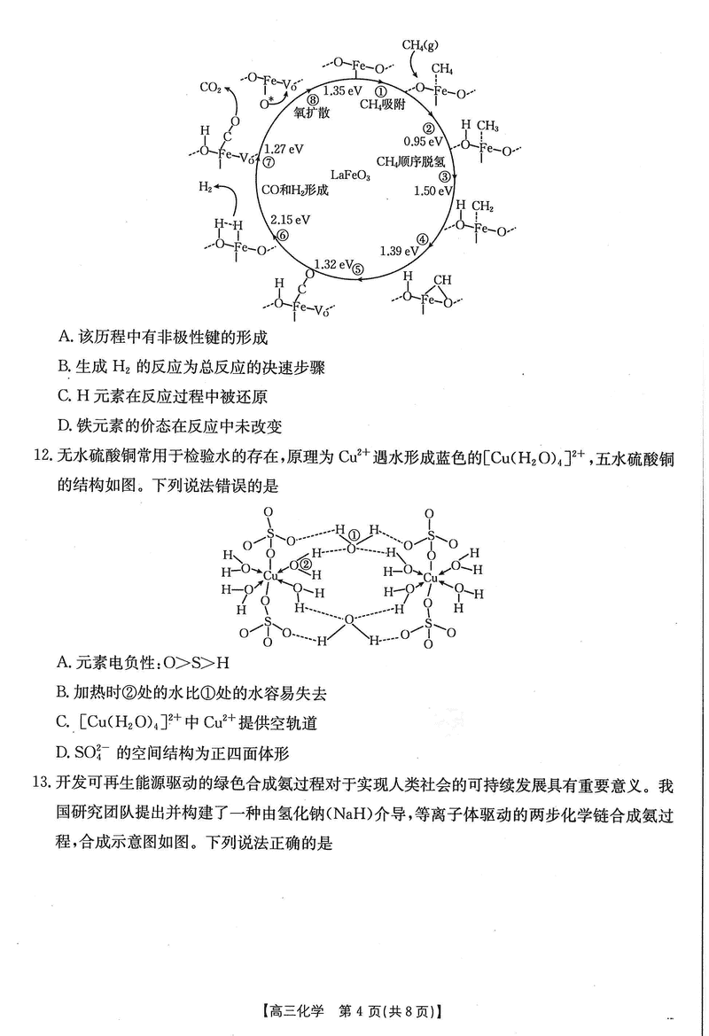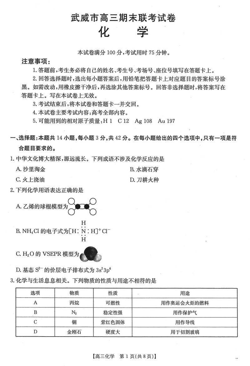 甘肃武威2025届高三上学期1月期末联考化学试题及答案