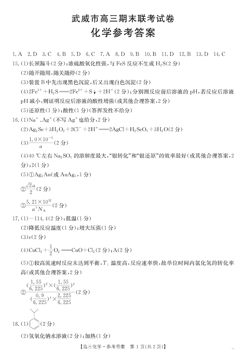 甘肃武威2025届高三上学期1月期末联考化学考试已于近日开考,为方便考生考后及时查看考试情况,查漏补缺、弥补不足,本文整理了试题答案解析相关信息!