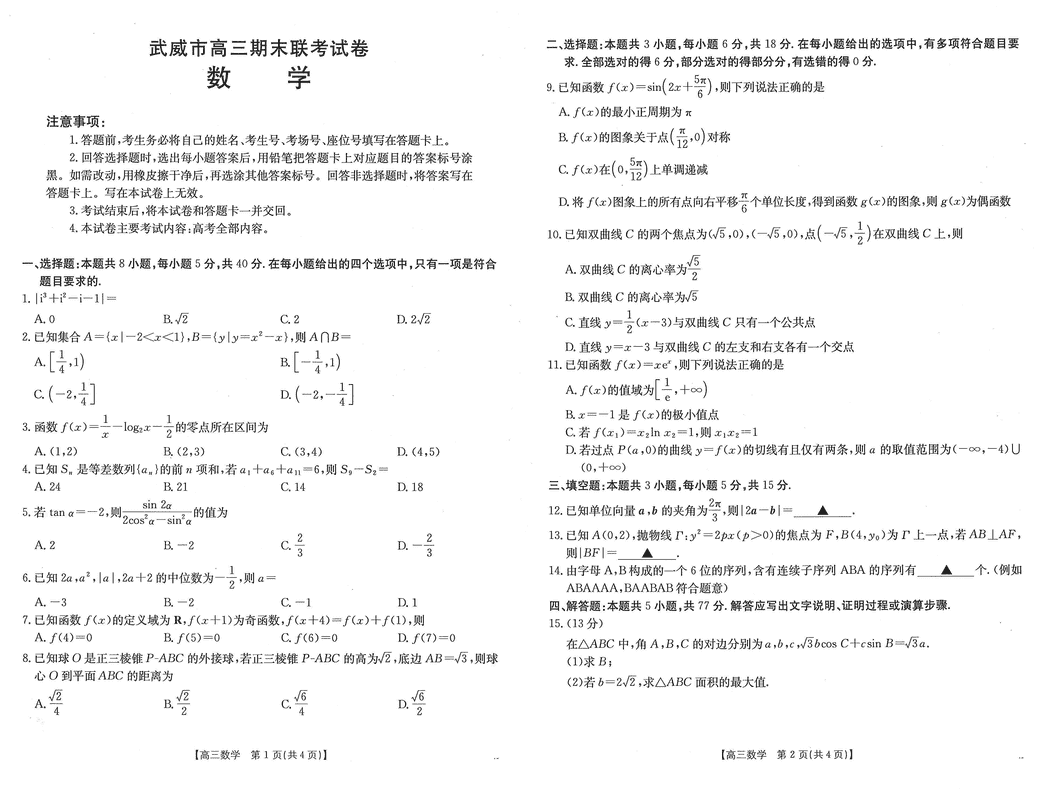 甘肃武威2025届高三上学期1月期末联考数学试题及答案