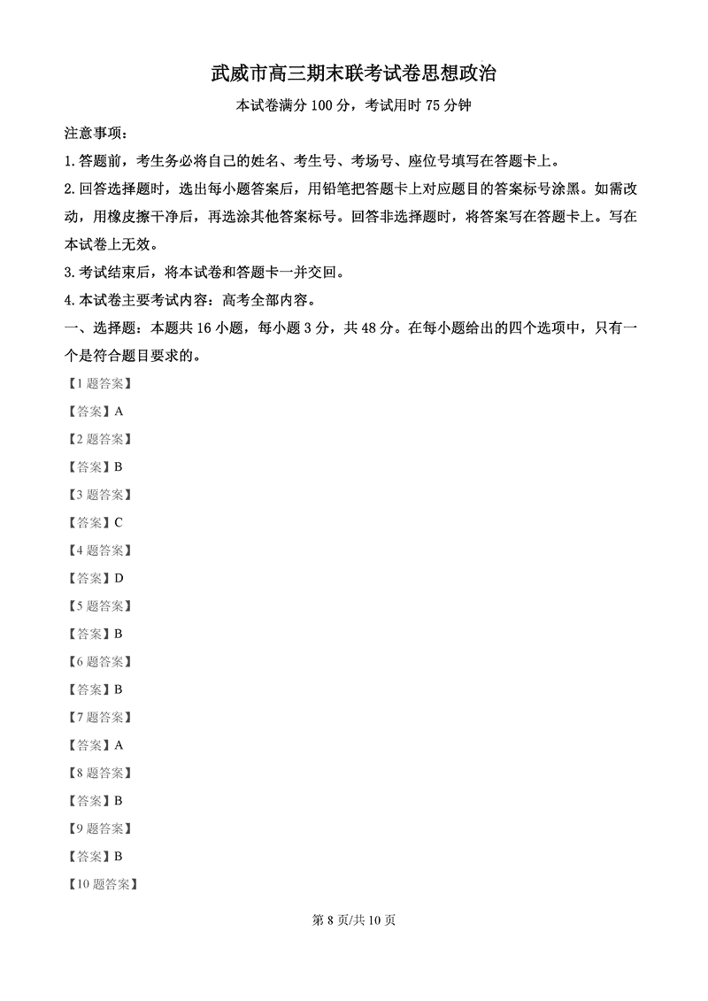 甘肃武威2025届高三上学期1月期末联考政治考试已于近日开考,为方便考生考后及时查看考试情况,查漏补缺、弥补不足,本文整理了试题答案解析相关信息!