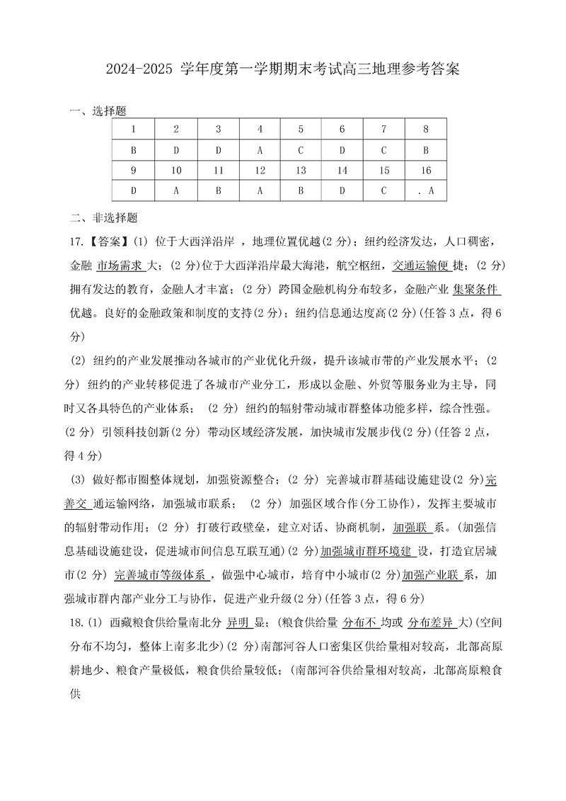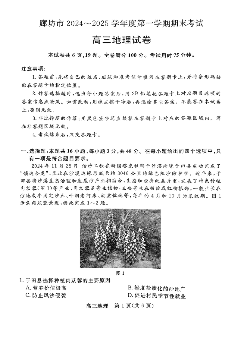 河北廊坊2025届高三上学期1月期末地理试题及答案