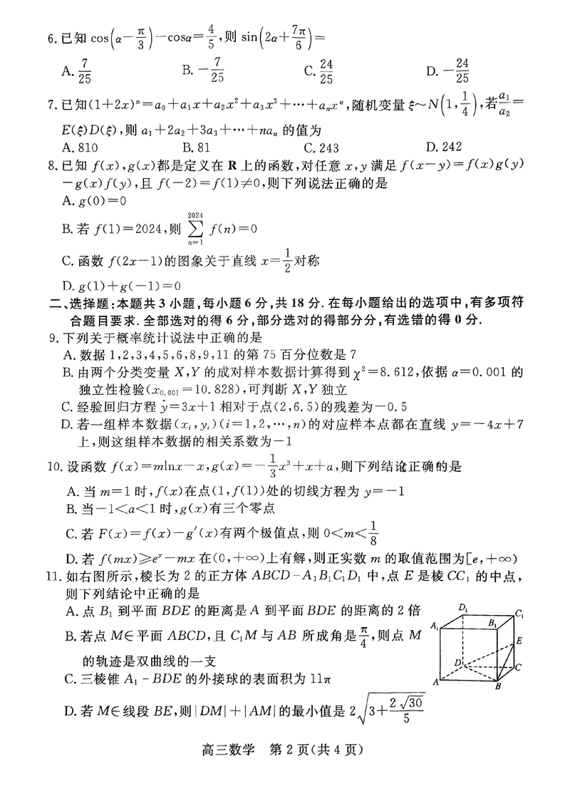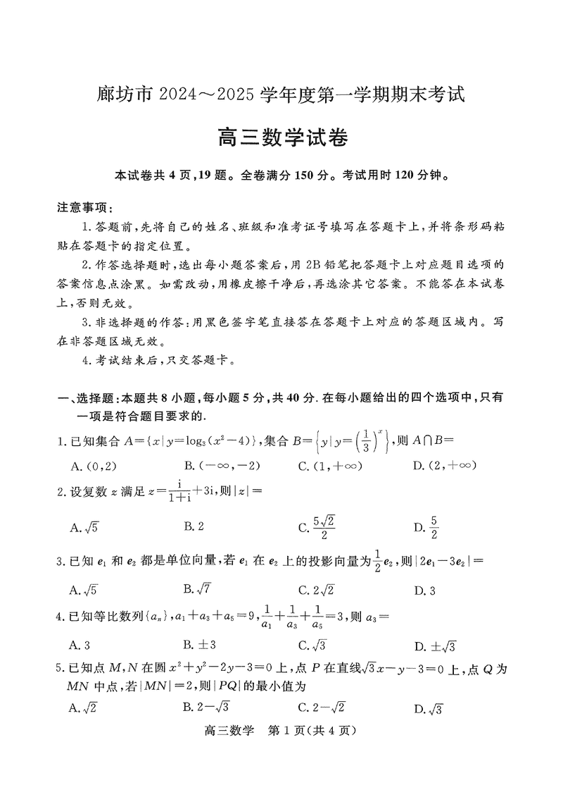河北廊坊2025届高三上学期1月期末数学试题及答案