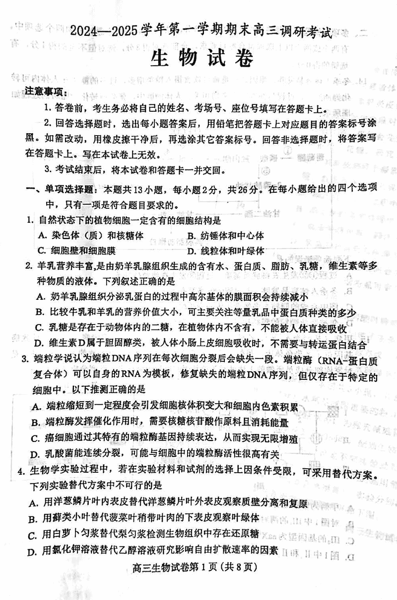 河北保定2024-2025学年高三上学期1月期末调研生物试题及答案