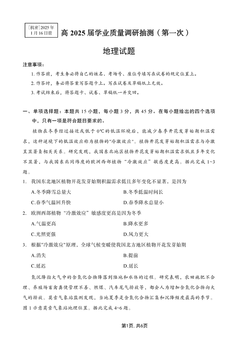 重庆主城五区一诊暨九龙坡高2025届学业质量调研地理试题及答案