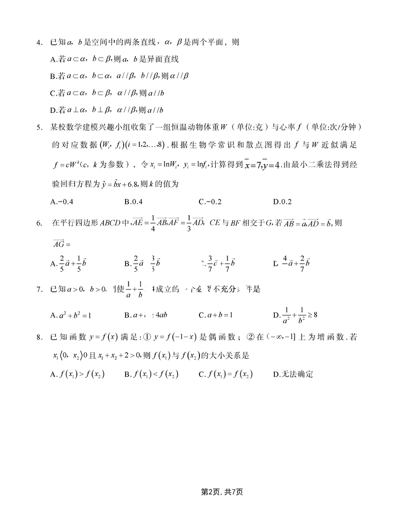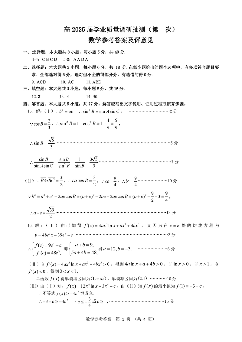 重庆主城五区一诊暨九龙坡高2025届学业质量调研数学试题及答案