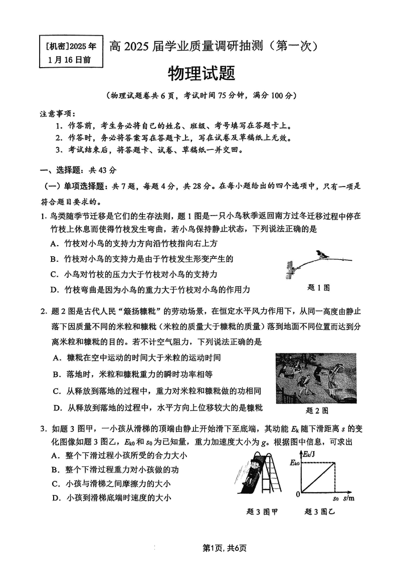 重庆主城五区一诊暨九龙坡高2025届学业质量调研物理考试已于近日开考,为方便考生考后及时查看考试情况,查漏补缺、弥补不足,本文整理了试题答案解析相关信息!