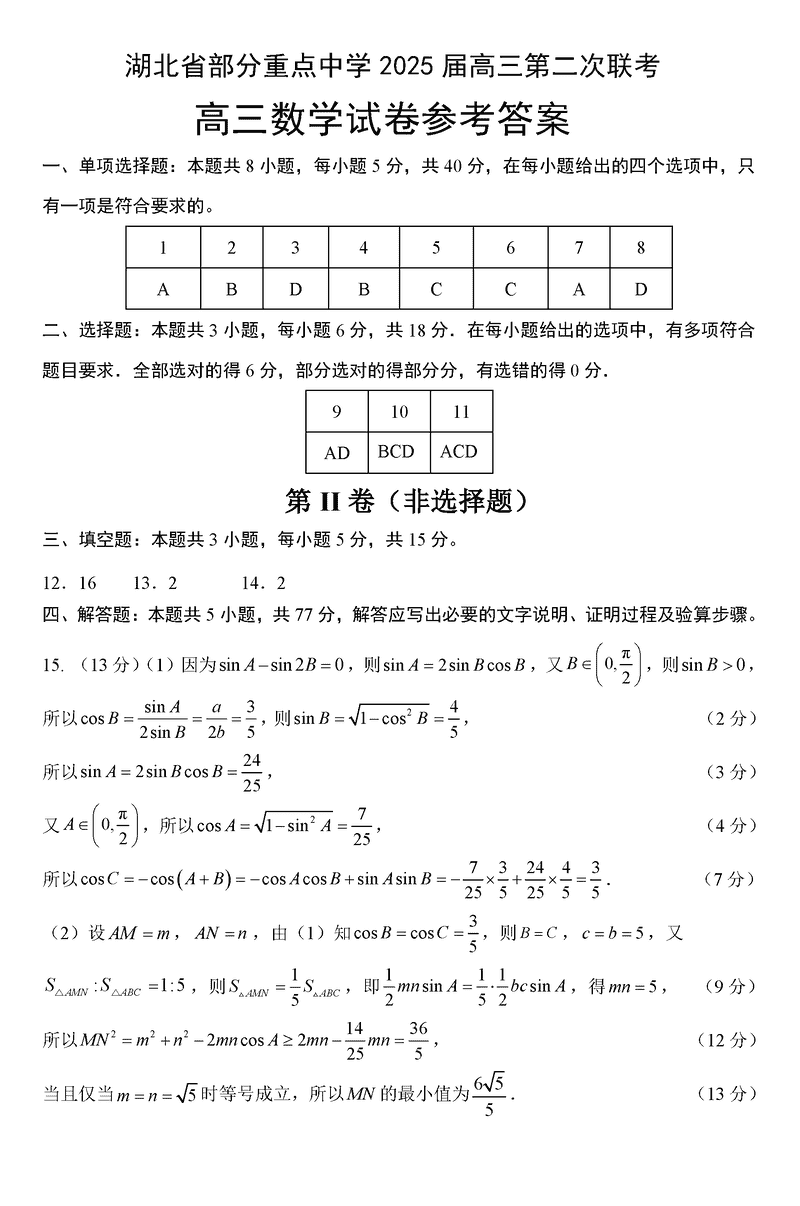 湖北省部分重点中学2025届高三第二次联考数学考试已于近日开考,为方便考生考后及时查看考试情况,查漏补缺、弥补不足,本文整理了试题答案解析相关信息!