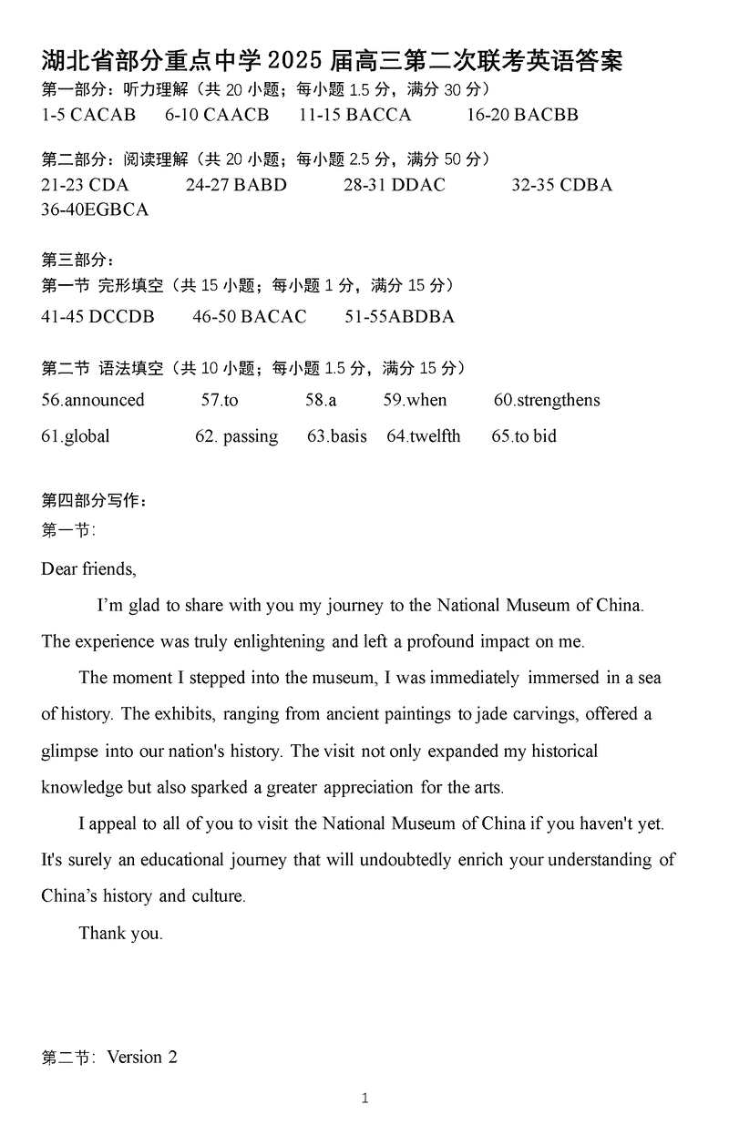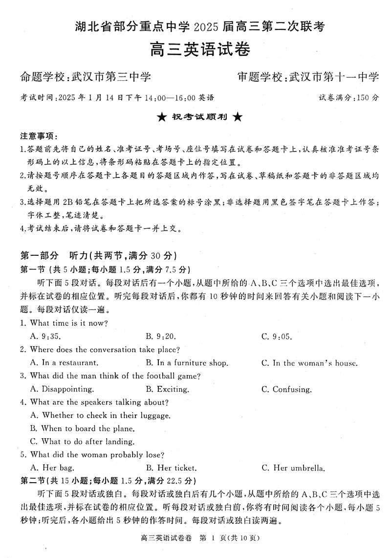 湖北省部分重点中学2025届高三第二次联考英语考试已于近日开考,为方便考生考后及时查看考试情况,查漏补缺、弥补不足,本文整理了试题答案解析相关信息!