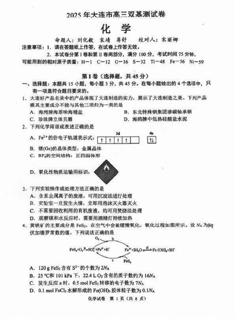 大连市2025年高三1月期末双基测试化学试题及答案