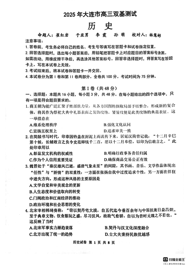 大连市2024-2025学年高三1月期末双基测试历史考试已于近日开考,为方便考生考后及时查看考试情况,查漏补缺、弥补不足,本文整理了试题答案解析相关信息!