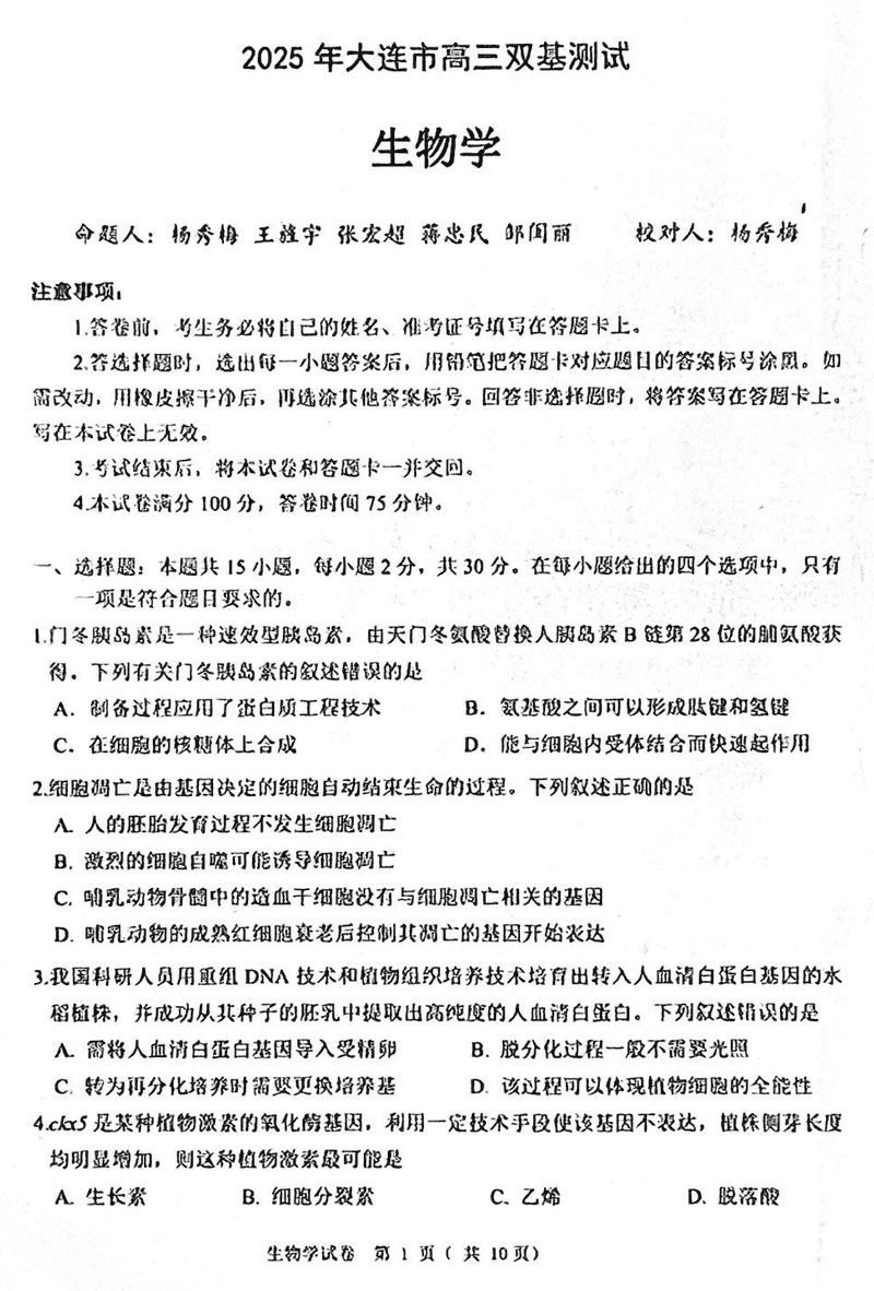 大连市2025年高三1月期末双基测试生物试题及答案