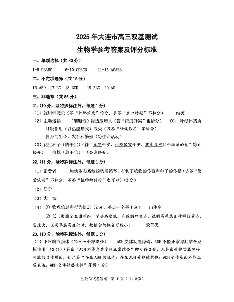 大连市2024-2025学年高三1月期末双基测试生物考试已于近日开考,为方便考生考后及时查看考试情况,查漏补缺、弥补不足,本文整理了试题答案解析相关信息!