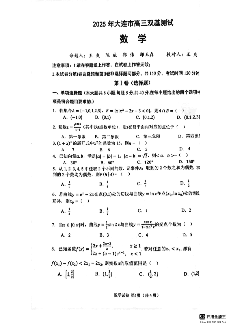 大连市2024-2025学年高三1月期末双基测试数学考试已于近日开考,为方便考生考后及时查看考试情况,查漏补缺、弥补不足,本文整理了试题答案解析相关信息!