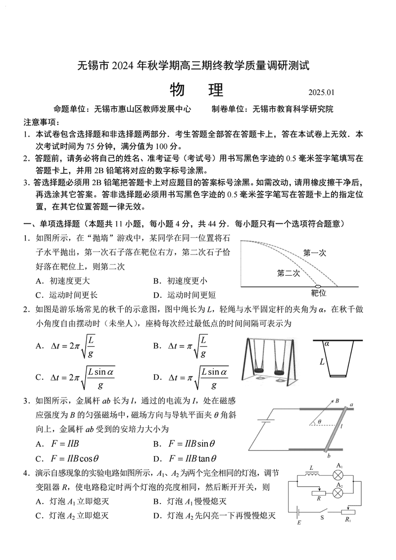 江苏无锡2025届高三期终教学质量调研物理试题及答案 时间:2025-01-17 江苏 理综试题 江苏无锡2025届高三期终教学质量调研物理考试已于近日开考,为方便考生考后及时查看考试情况,查漏补缺、弥补不足,本文整理了试题答案解析相关信息! 汇总:江苏无锡2025届高三期终教学质量调研试题及答案汇总 物理试题及答案解析