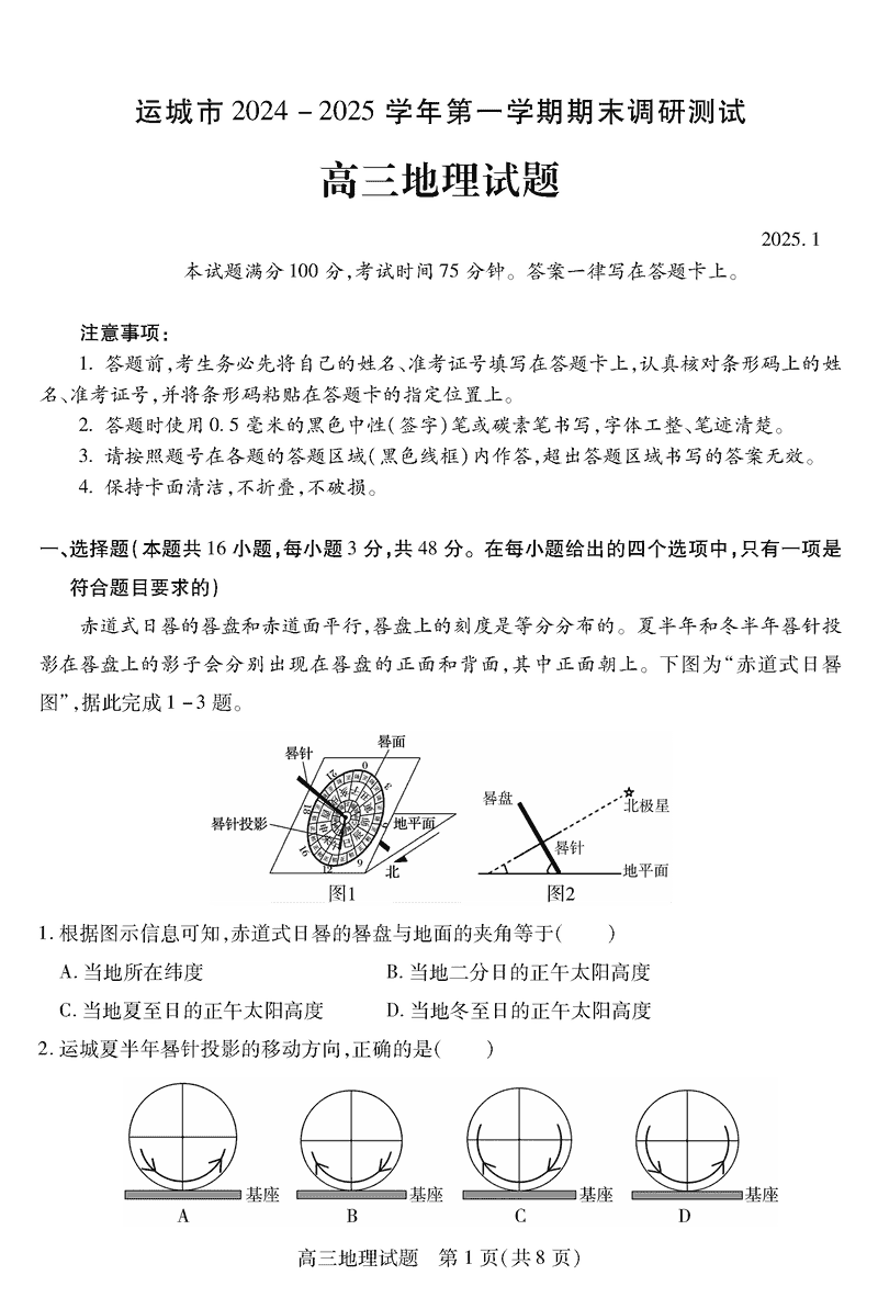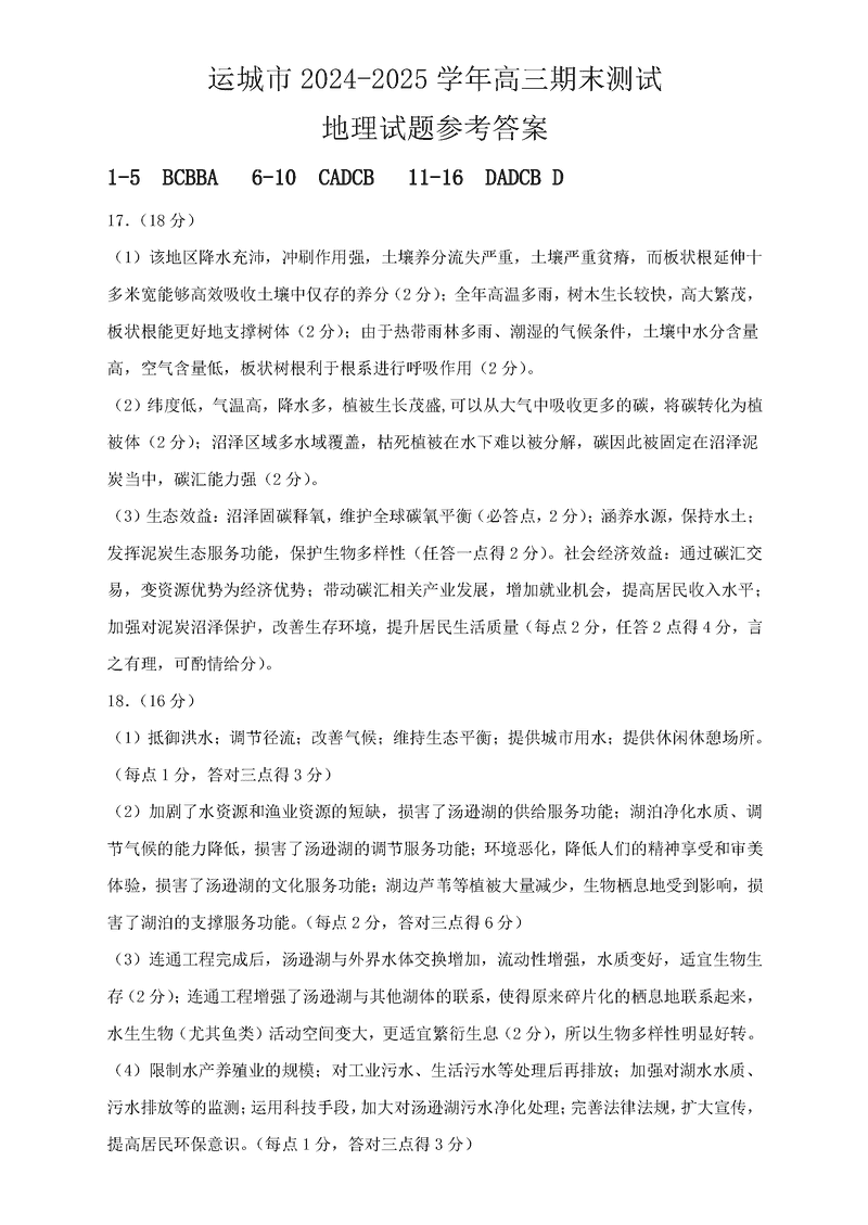 运城市2025年1月高三上学期期末调研地理考试已于近日开考,为方便考生考后及时查看考试情况,查漏补缺、弥补不足,本文整理了试题答案解析相关信息!