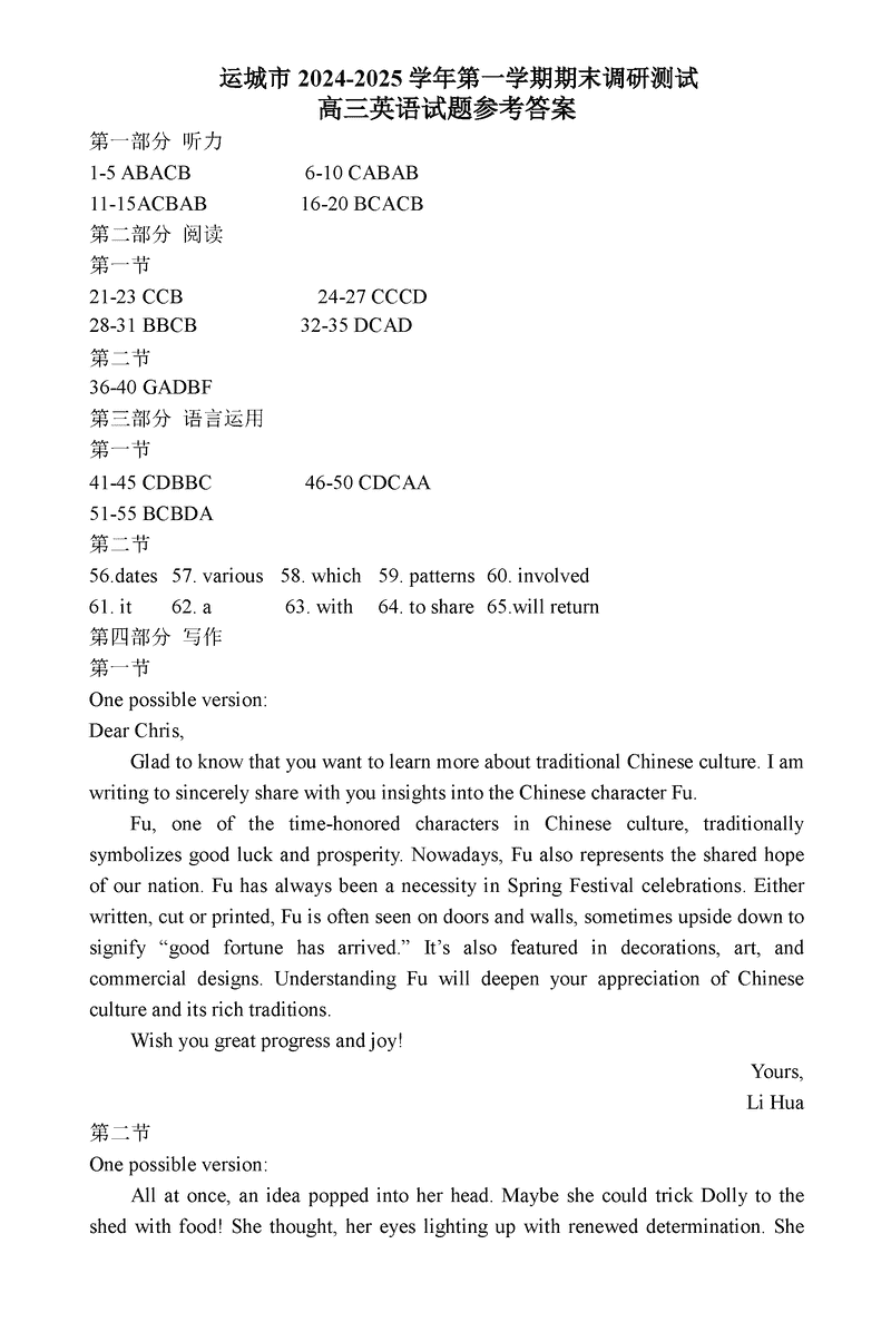 运城市2025年1月高三上学期期末调研英语考试已于近日开考,为方便考生考后及时查看考试情况,查漏补缺、弥补不足,本文整理了试题答案解析相关信息!