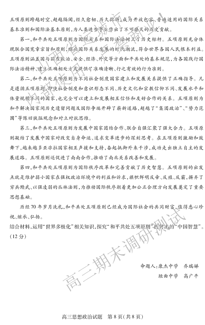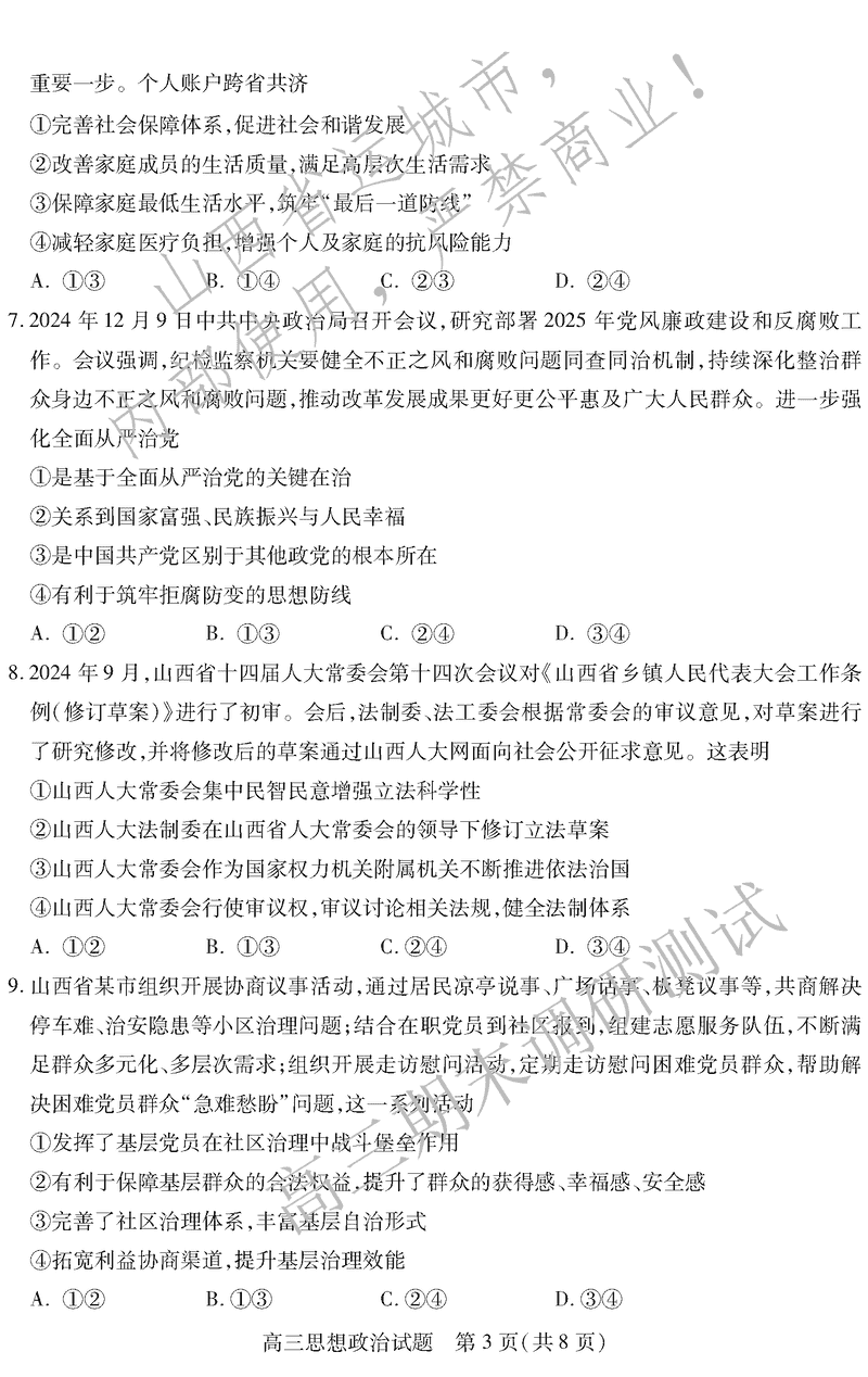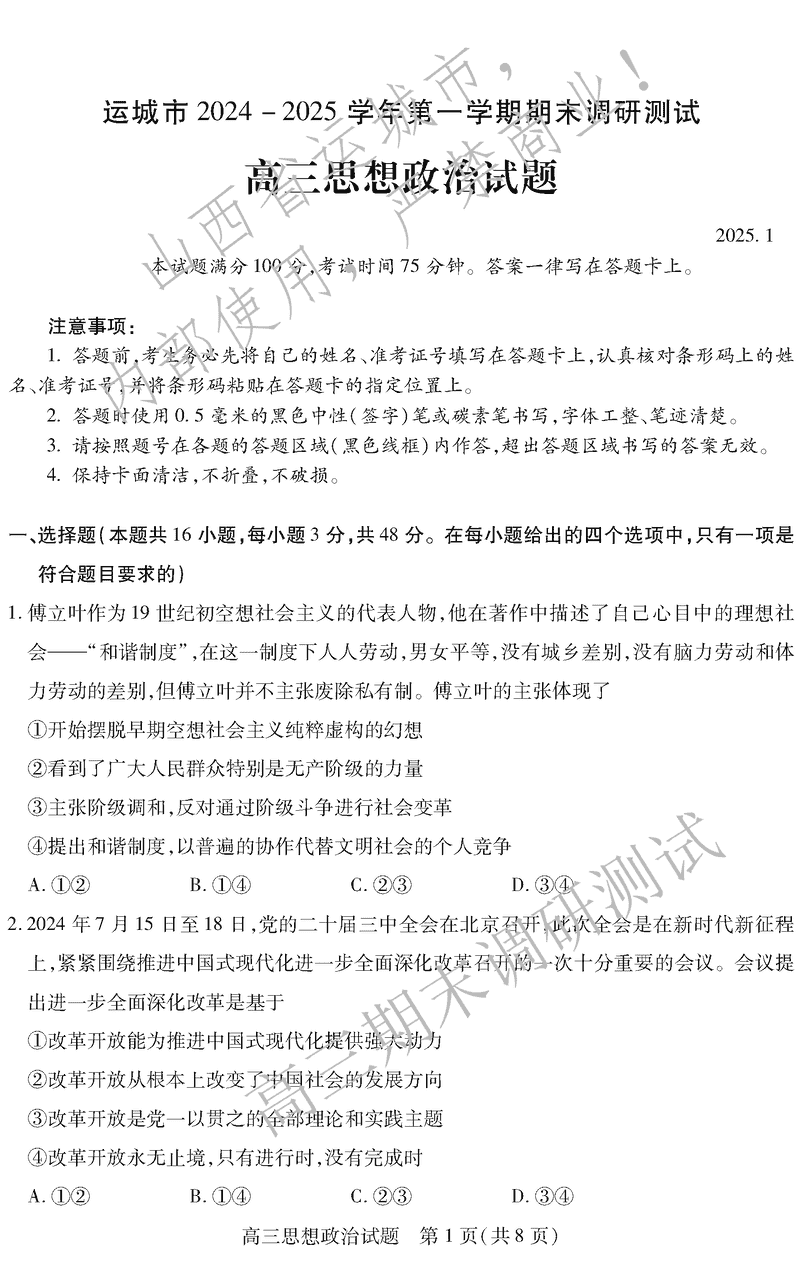 运城市2025年1月高三上学期期末调研政治试题及答案
