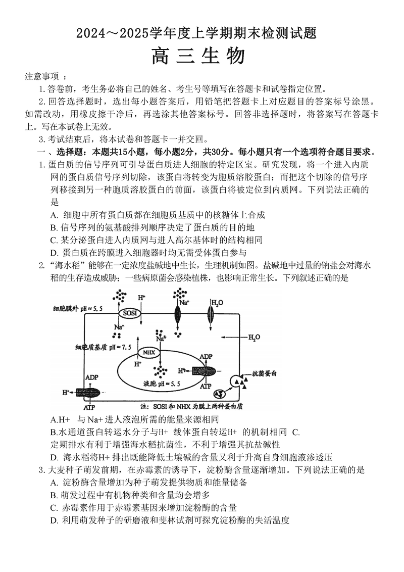 潍坊市、临沂市2025届高三上学期期末生物试题及答案