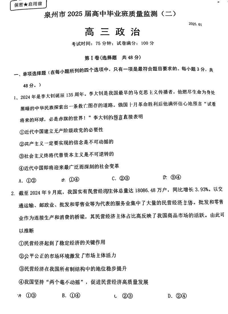 福建泉州2025届高中毕业班质量监测(二)政治考试已于近日开考,为方便考生考后及时查看考试情况,查漏补缺、弥补不足,本文整理了试题答案解析相关信息!